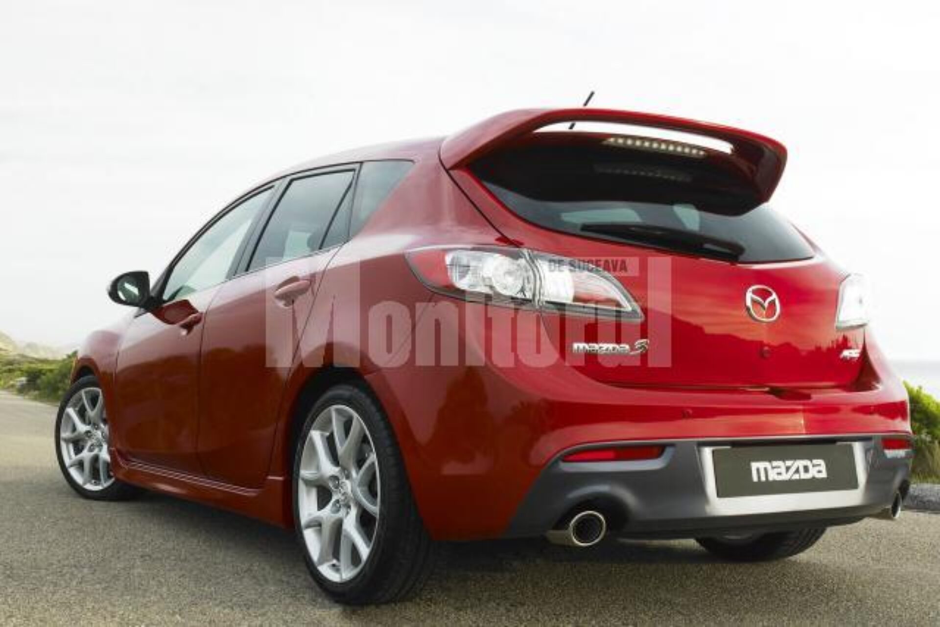 Mazda3 MPS se individualizează prin gura de aerisire montată pe capotă, liniile cromate de la nivelul grilei față, praguri mai generoase, eleron spate, două țevi de eșapament cromate, jante de 18 inch din aliaj ușor.
