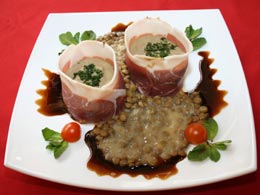 Pasați lintea și condimentați crema cu ulei de măsline, sare și piper. Tăiați cele două bucăți file de porc în circa 12 medalioane de circa 4 cm grăsime. Înfășurați câte o felie de speck în jurul lor, fixați cu o scobitoare și prăjiți medalioanele în tigaie, cu unt și 5-6 frunze de salvie. Acoperiți și lăsați să se coacă carnea 4 minute, pe fiecare parte și stropiți cu câteva picături de vin alb. Adăugați crema de linte pe medalioane și serviți-le cu câteva frunze de salată creață.