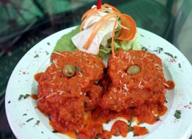 Cotletul se taie în 2 tranșe și se face la grătar la fel și feliile de măr. Apoi se așează cele două gutoane pe o farfurie peste care se pun transele de cotlet și feliile de măr se toarnă sosul încălzit în prealabil și se ornează cu cele două măsline.