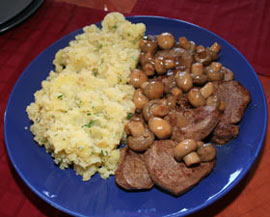 Se împarte mușchiul câte 2 bucăți la porție, se unge cu ulei de măsline și se condimentează.