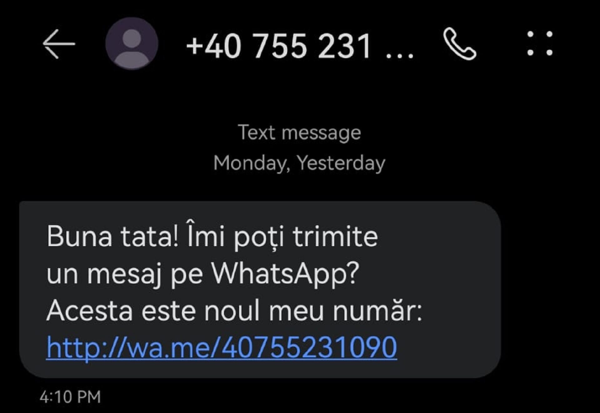 ”Bună tata! Îmi poți trimite un mesaj WhatsApp? Acesta este noul meu număr”.