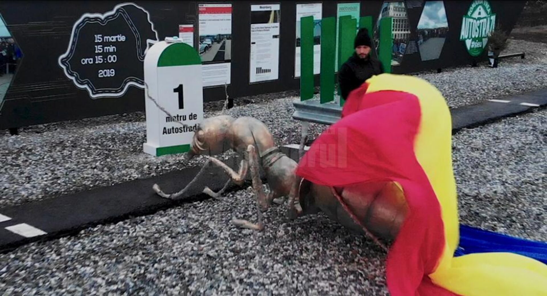 Tot ieri, omul de afaceri sucevean a publicat pe contul său de Facebook și un scurt film, făcut la ora 15:15, în care apare singur, mergând pe singurul metru de autostradă din regiunea Moldovei, pe care l-a construit la Suceava. Ștefan Mandachi se îndreaptă spre un obiect acoperit cu un imens Tricolor. După ce trage Drapelul României, de sub acesta apare o imensă furnică, care stă cu picioarele pe metrul de autostradă și cu fața spre borna pe care scrie „1 metru de autostradă”.
