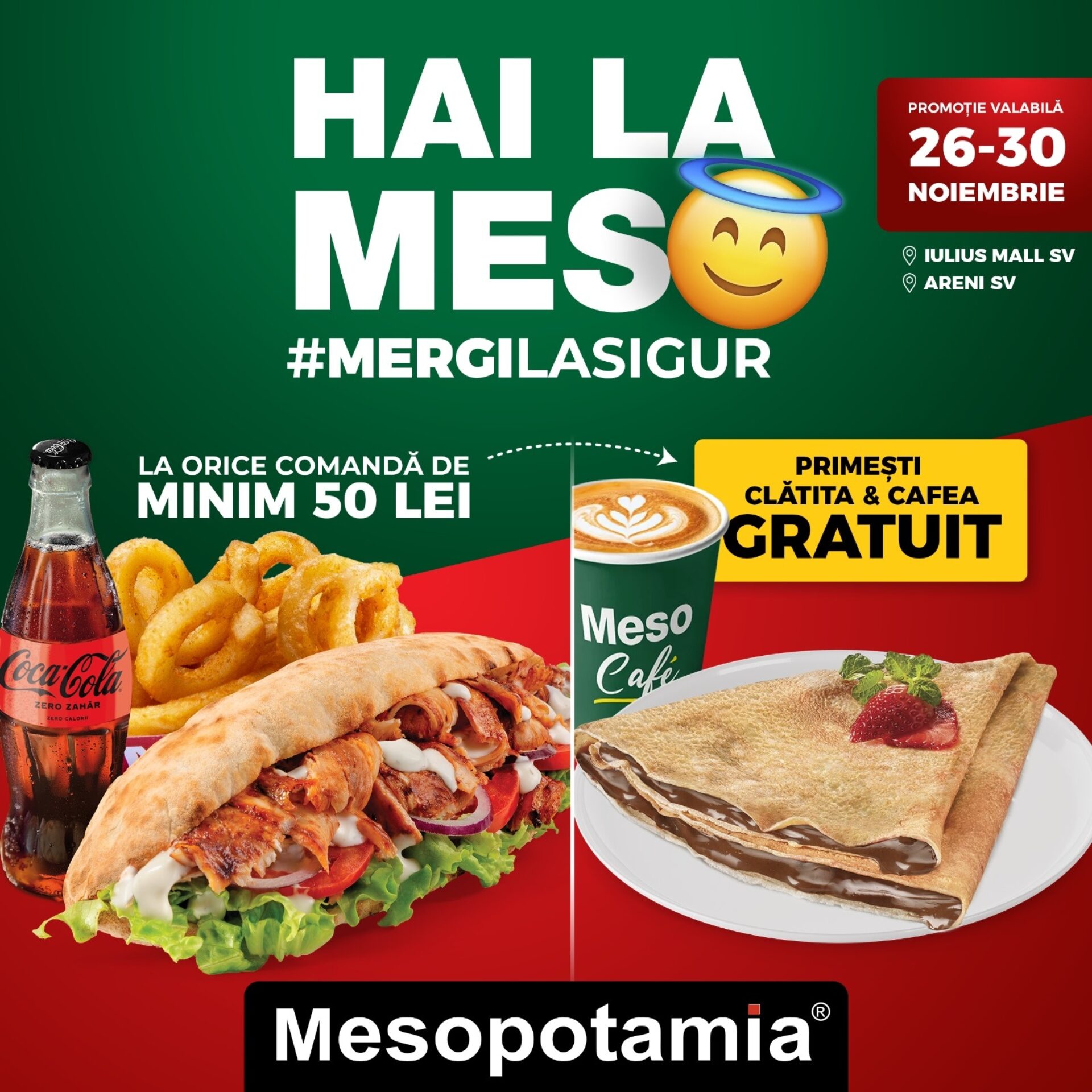 Mesopotamia, unul dintre cele mai apreciate branduri QSR din România, aduce o ofertă specială pentru suceveni în perioada 26–30 noiembrie, în locațiile din Iulius Mall și Areni. Timp de cinci zile, la orice comandă de minimum 50 de lei, clienții primesc gratuit o clătită și o cafea la alegere, iar la orice clătită comandată, cafeaua este oferită din partea casei.