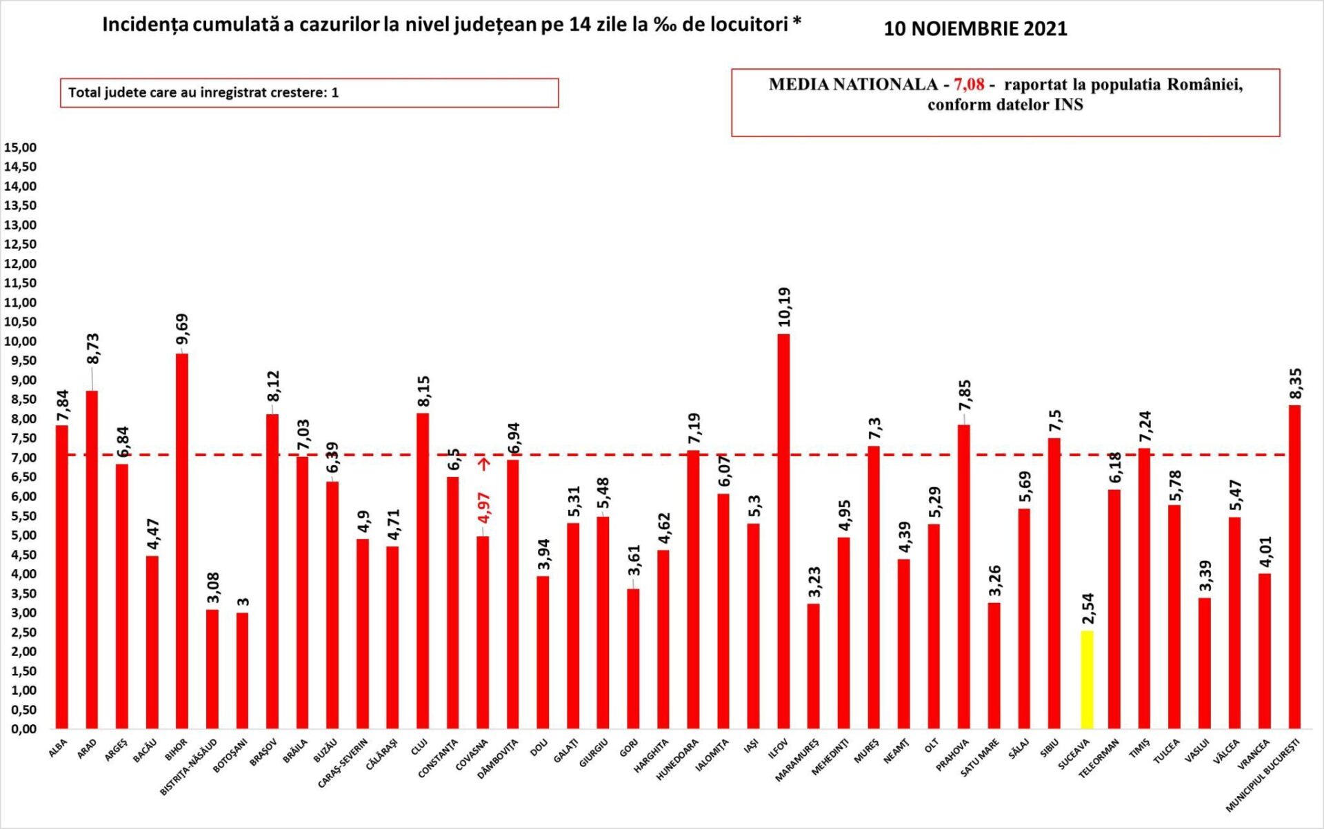 În intervalul 9-10 noiembrie, în spitalele din județ au fost internate 27 de persoane cu Covid-19 și au fost externate 61 persoane. În aceeași perioadă de referință au murit 7 suceveni ca urmare a infectării cu Covid. În spitale sunt internați la ceastă dată 397 de pacienți cu Covid. În continuare nu este nici un loc liber la ATI Covid.