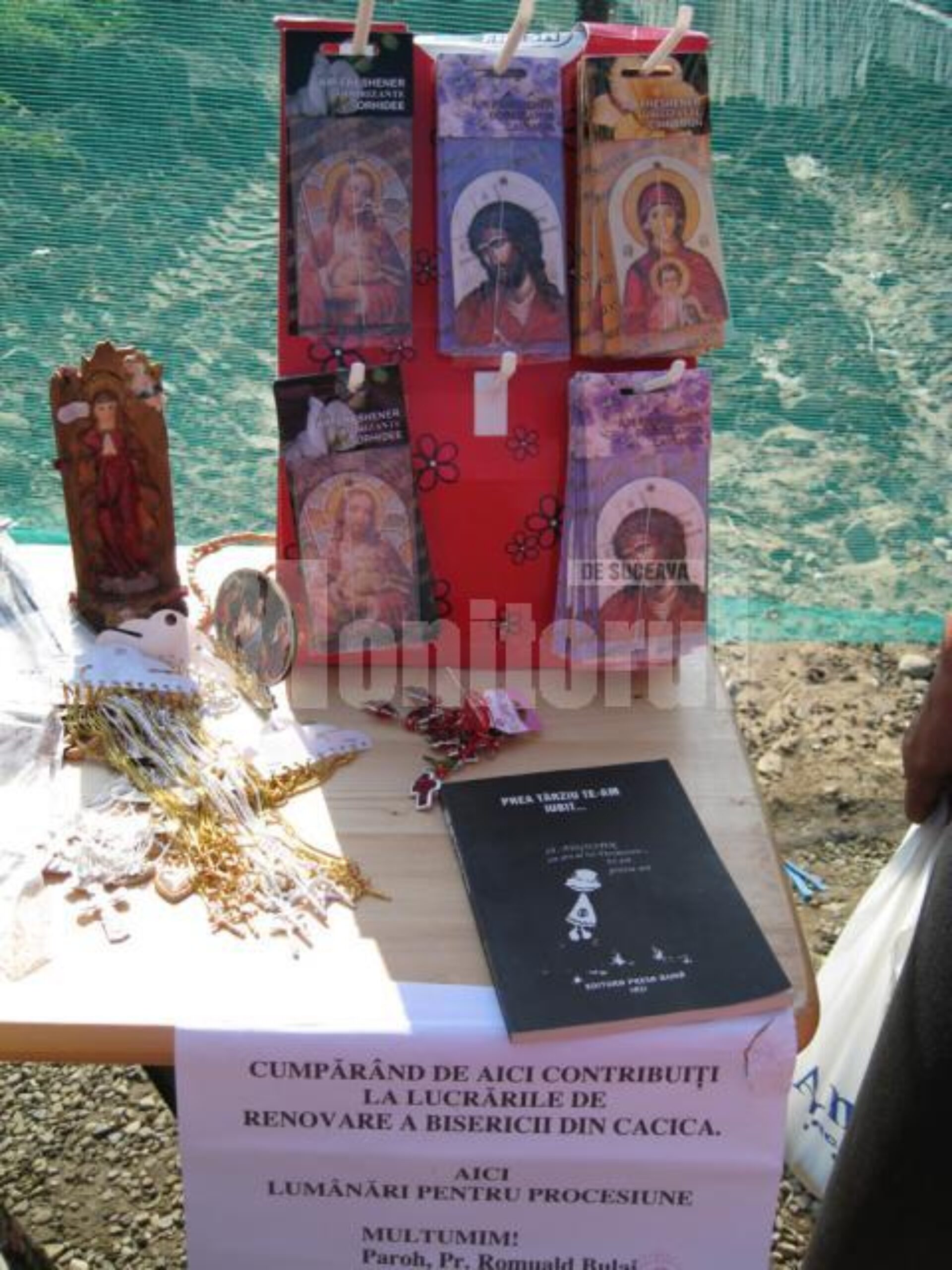 La Cacica, același amestec de evlavie și bazar. În curtea sanctuarului, în stânga aleilor, lângă zidurile bisericii preoții spovedeau credincioșii, iar de partea cealaltă comercianții au scos la vânzare odorizante de mașină cu chipul lui Iisus și al Fecioarei Maria, cu arome de lavandă și orhidee, la 5 lei bucata, iconițe, cruciulițe, odioase statui de ghips, de diferite mărimi, care aveau pretenția că o reprezintă pe Fecioara, la prețuri de la 30 la 400 de lei, casete pentru rozarii și tot felul de obiecte strălucitoare sau din ghips vândute pe post de suveniruri religioase.