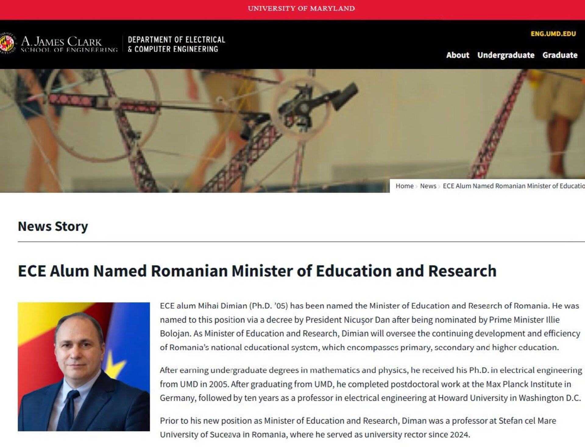 Ministrul Educației, Mihai Dimian, a preluat pe contul său de Facebook o declarație a fostului său conducător de doctorat de la Universitatea Maryland, din SUA, prof. univ. dr. Isaak Mayergoyz, publicată pe site-ul instituției academice după ce universitarul sucevean a fost numit ministru. Aprecierile profesorului american sunt puse în antiteză cu etichetări ale profesorului Dimian, făcute de unii comentatori din România.