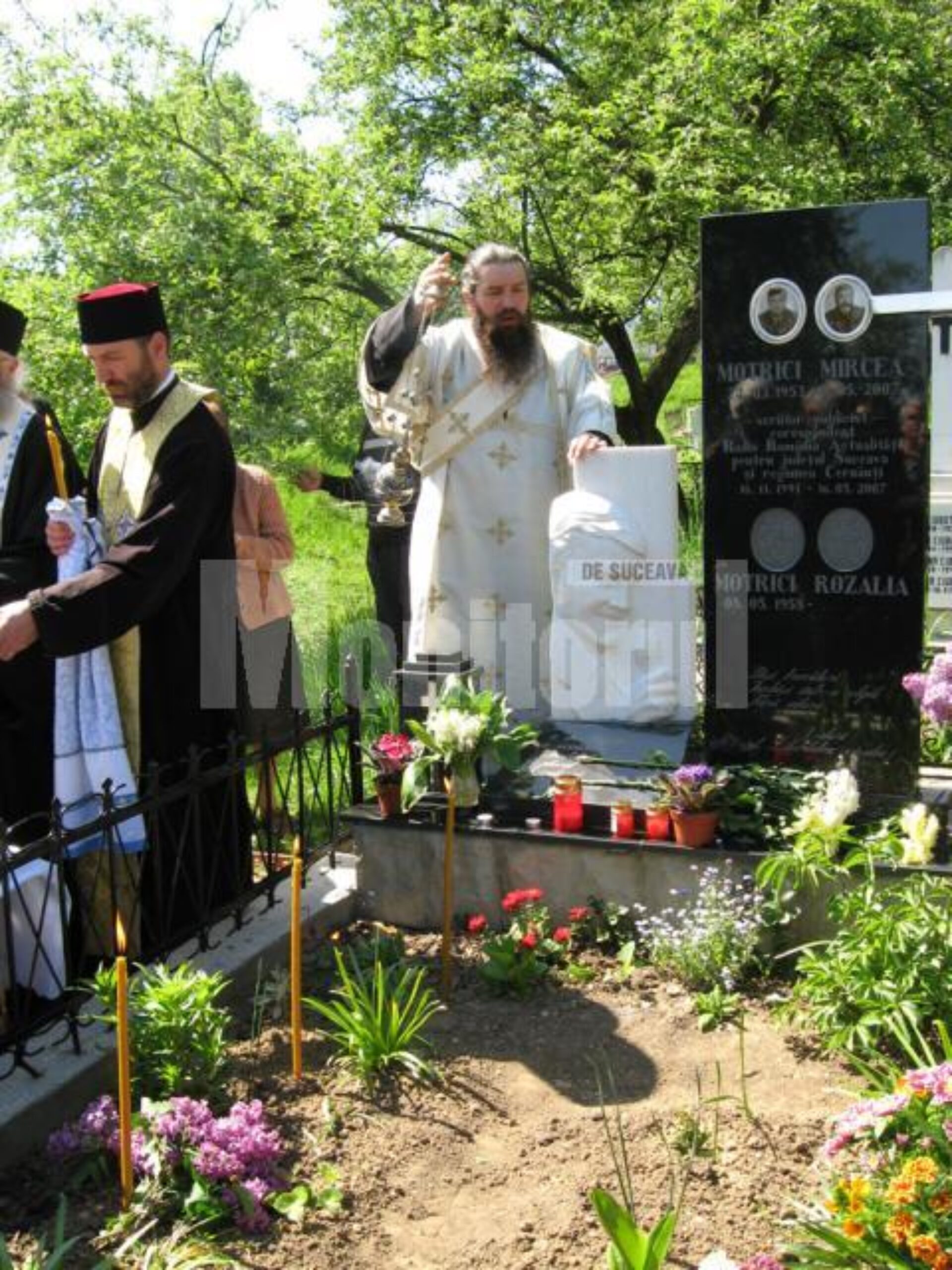 Popas de pomenire s-a făcut și la mormântul din cimitirul satului, la monumentul funerar care îngemănează două plăci de marmură neagră vegheate, la o margine, de efigia în basorelief a lui Mircea Motrici, cu microfonul său de slujitor, până-n ultimul moment, al postului Radio România Actualități.
