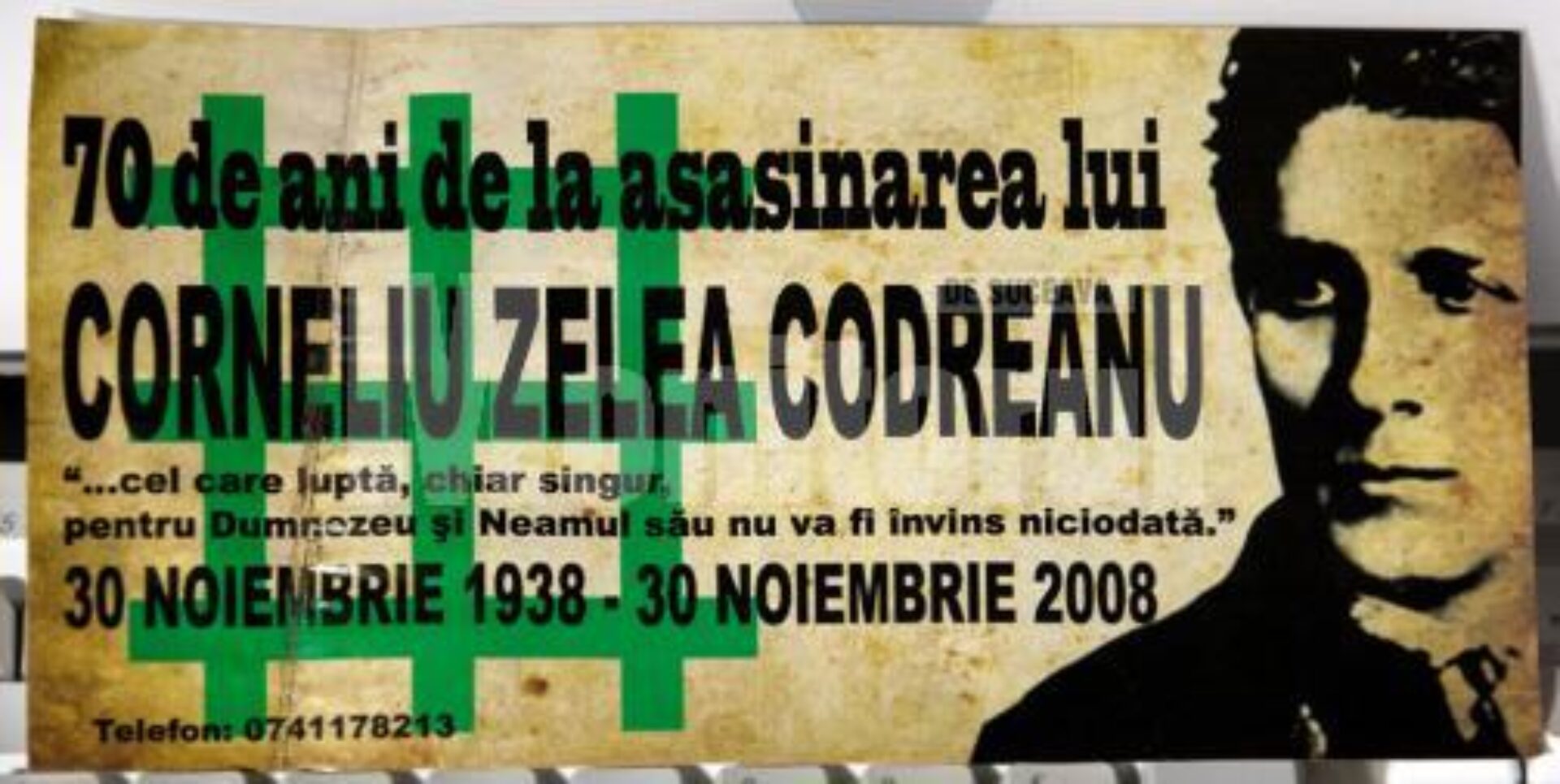 „Cel care luptă, chiar singur pentru Dumnezeu și neamul său, nu va fi învins niciodată. 70 de ani de la asasinarea lui Corneliu Zelea Codreanu, 30 noiembrie 1938-30 noiembrie 2008”, scria pe fluturași, alături de un număr de telefon mobil.