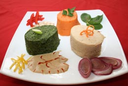 Misto verde: Frecați spanacul cu ingredientele rămase. Umpleți cu aceste compoziții 12 forme de flan și coaceți la vapori timp de 10 minute.