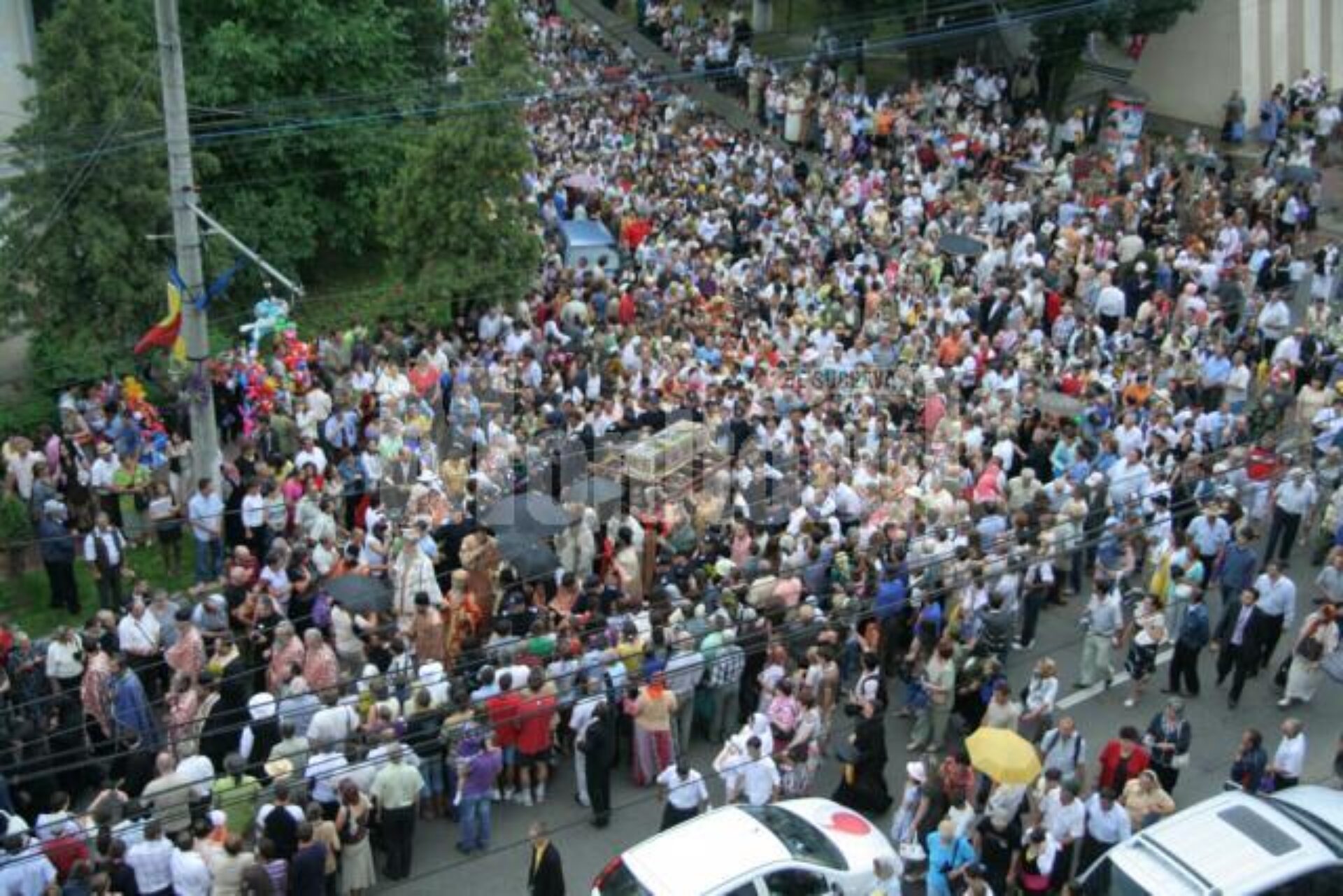După oficierea Sfintei Liturghii, racla cu moaștele Sfântului Ioan cel Nou de la Suceava a fost protejată cu o folie de plastic pentru a nu fi udată de ploaie, și purtată pe străzile municipiului într-o procesiune la care au luat parte mii de credincioși.