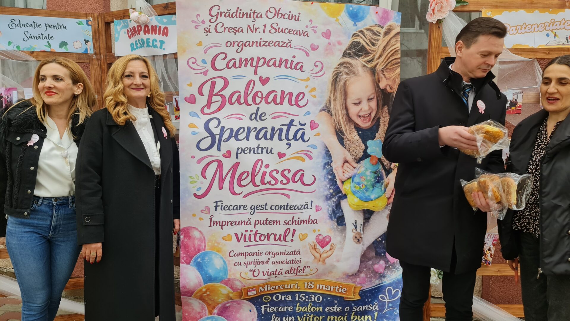 Uniți suntem mai puternici la greu și dăm o șansă binelui – asta au demonstrat miercuri părinții copiilor de la Creșa Nr. 1 Suceava și Grădinița Obcini, care, împreună cu cadrele didactice, au organizat o strângere de fonduri mai aparte – ”Baloane de speranță pentru Melisa”. Rezultatul a depășit toate așteptările, fiind strânși din donații și vânzări de bunuri 14.600 de lei și 50 de euro, pentru ajutorarea Melisei, o fetiță de 8 anișori, cu probleme grave, care a fost prezentă la eveniment, împreună cu mama sa. Pentru ea există speranțe de mai bine de la un tratament revoluționar, cu celule stem.