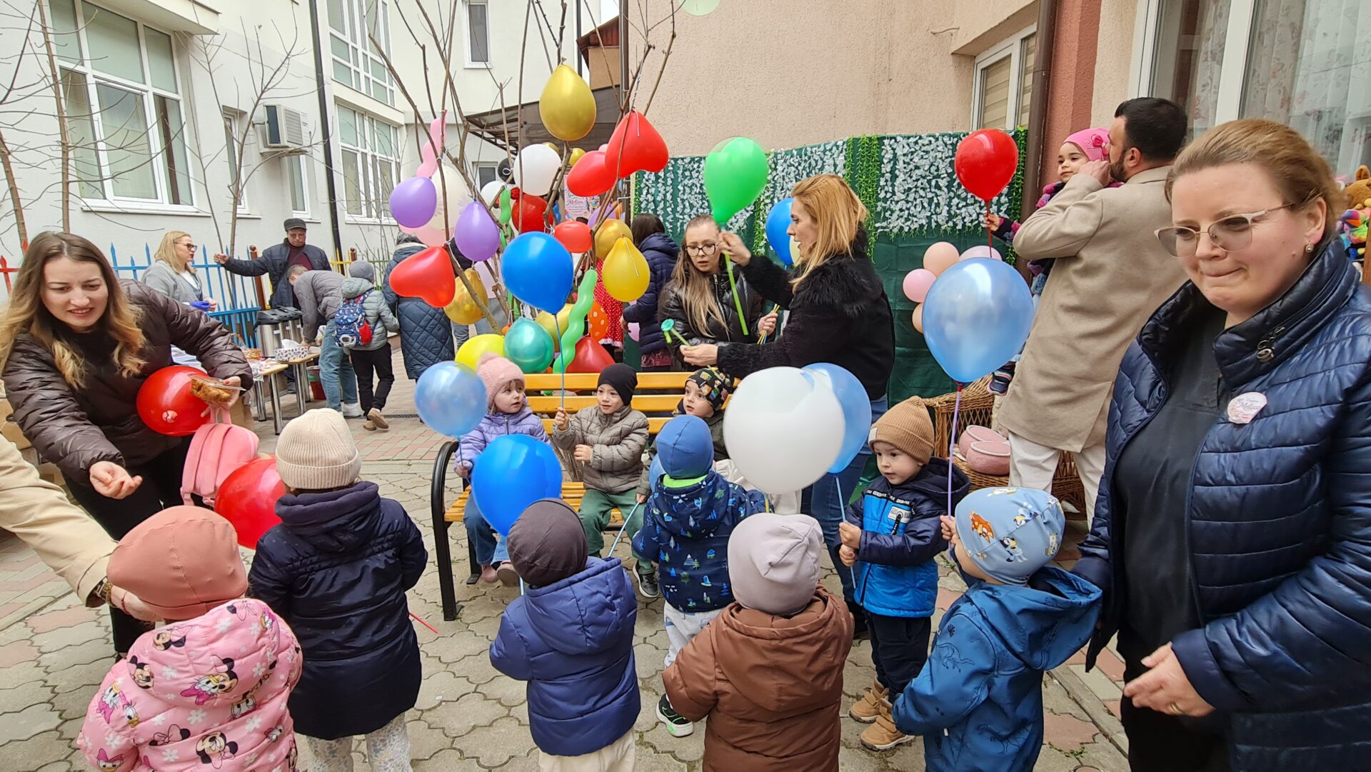 Dacă dimineață părinții care au adus copiii au fost invitați la o cafea unde, în loc să o plătească, au făcut o mică donație, după-amiază, în jurul orei 16.00, în curtea Creșei a fost organizat un târg caritabil. Sfințișori, plăcinte, covrigi, dulciuri, prăjituri de casă, borcane cu dulceață, sărmăluțe cu miros îmbietor, ceai, cafea, dar și baloane și jucării din baloane au fost cumpărate de cei care au venit să ia acasă copiii, oprindu-se și pe la târg.