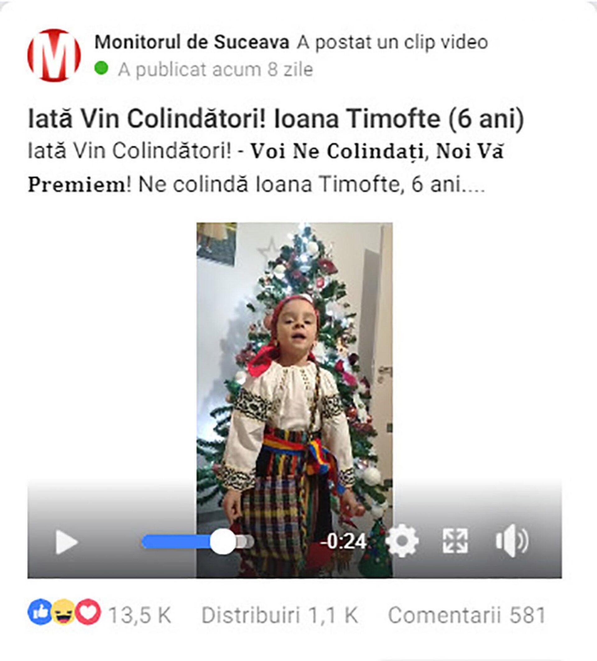 Colindul ei a adunat peste 13.500 de like-uri și peste 1.100 de distribuiri, totalizând 33.500 minute de vizionare, conform statisticilor paginii de Facebook Monitorul de Suceava, cele mai multe vizualizări ale clipului video fiind din județele Suceava, București, Iași, Bacău, Botoșani, Neamț, Constanța, Timiș, Galați, iar ca țări, pe lângă România, cele mai multe fiind din Italia, Germania, Anglia, Spania și Republica Moldova.