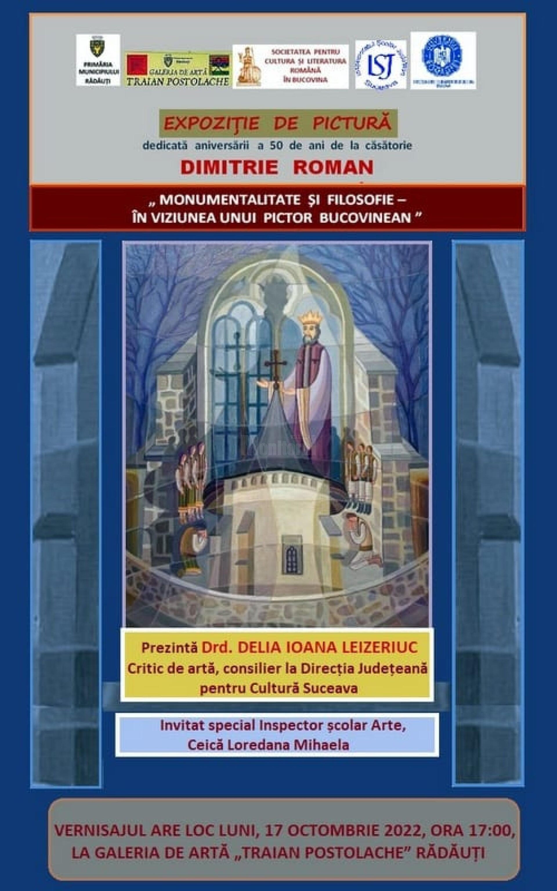 La Galeria de Artă„Traian Postolache” din Rădăuți va avea loc astăzi, 17 octombrie, la ora 17:00, Expoziția de pictură „Monumentalitate și filosofie în viziunea unui pictor bucovinean”, dedicată aniversării a 50 de ani de căsătorie a artistuluiDimitrie Roman.