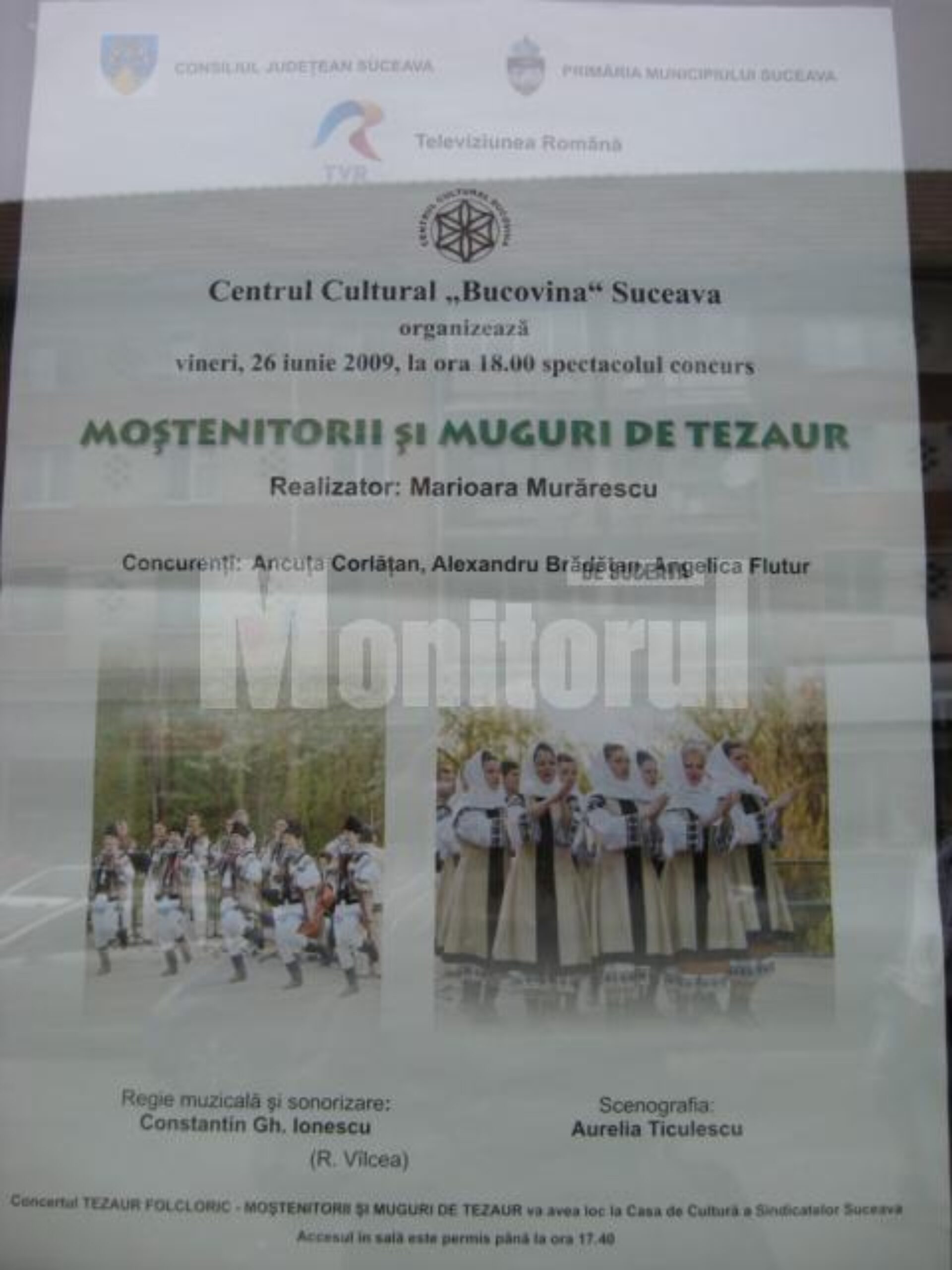 La Casa de Cultură Suceava va avea loc vineri, 26 iunie, la ora 18:00, Spectacolul concurs „Moștenitorii și muguri de tezaur”, sub egida emisiunii „Tezaur Folcloric”, realizator Marioara Murărescu – TVR.