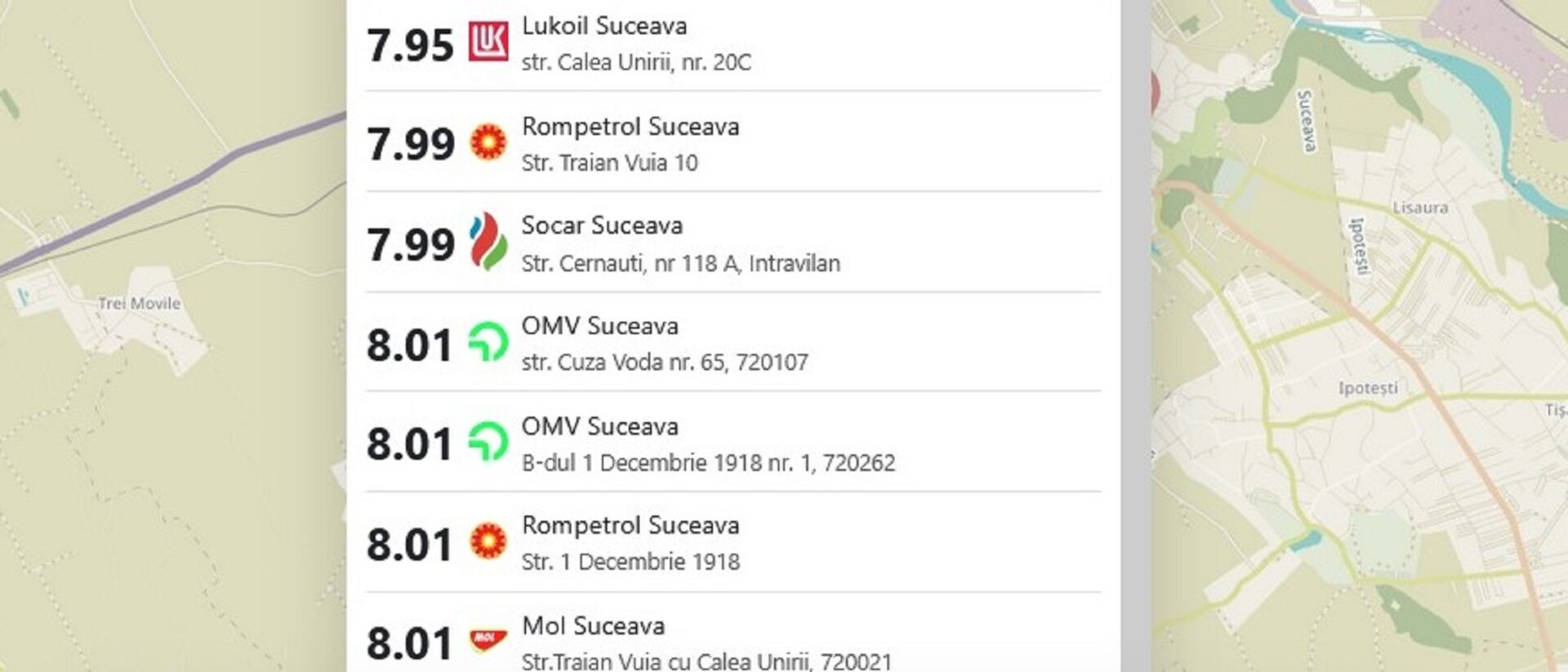 În schimb, la două stații OMV, una aparținând celor de la Rompetrol, dar și la Mol Suceava, motorina costă deja 8,01 lei/litru.