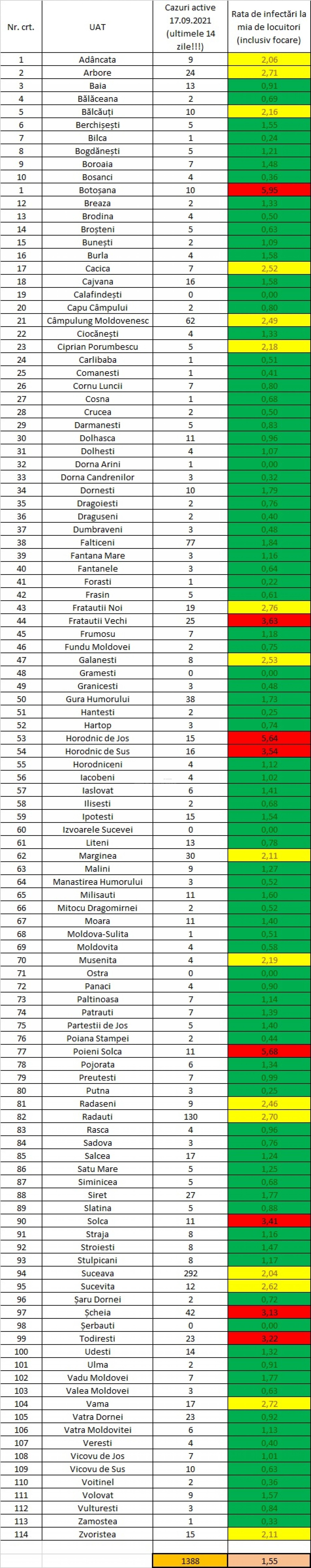 Conform distribuției cazurilor Covid-19 pe unități administrativ-teritoriale, din cele 114 localități, 5 nu au niciun caz de infecție Covid-19 în evoluție, 8 au câte un caz, 38 au sub cinci cazuri, 30 au sub zece cazuri, iar 33 au peste zece cazuri în evoluție.