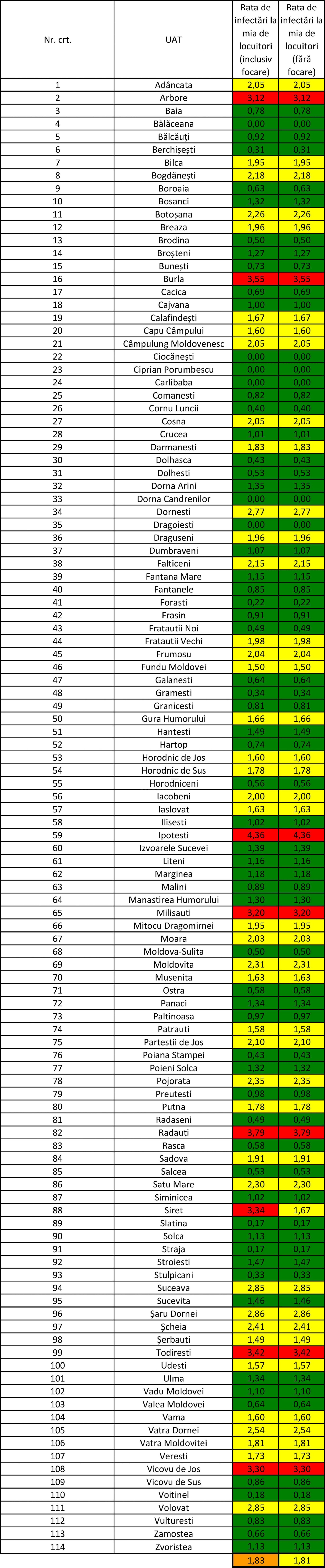 În municipiul Suceava incidența cazurilor pozitive se apropie din nou de zona roșie, vineri fiind de 2,85 la mie. Numărul localităților cu incidență de zonă roșie este la această dată de 8. Astfel, la Arbore incidența este de 3,12 la mie, la Burla – 3,56 la mie, la Ipotești – 4,36 la mie, la Milișăuți – 3,20 la mie, la Rădăuți – 3,79 la mie, la Siret – 3,34 la mie (cu focare și 1,67 la mie fără focare), la Todirești – 3,42 la mie, la Vicovu de Jos- 3,30 la mie.