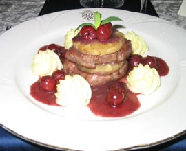 Se aranjează tip piramidă, pe mijlocul platoului, cu garnitură de piure de cartofi și sos de cireșe. Se decorează cu mentă.