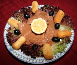 Se așează în platou, se decorează cu măsline și lămâie și se servește cald, însoțit de un pahar de vin roșu demidulce.