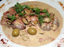Ceapa, șunca se taie cubulețe, usturoiul se zdrobește. Carnea se taie în 2 tranșe. Uleiul se pune la încins și se prăjește carnea. Ceapa, șunca, usturoiul se prăjesc în uleiul rămas. Se adaugă carnea și se stinge cu supa de pui și vin alb. Când e aproape gata se adaugă măslinele verzi tăiate jumătate și smântâna.
