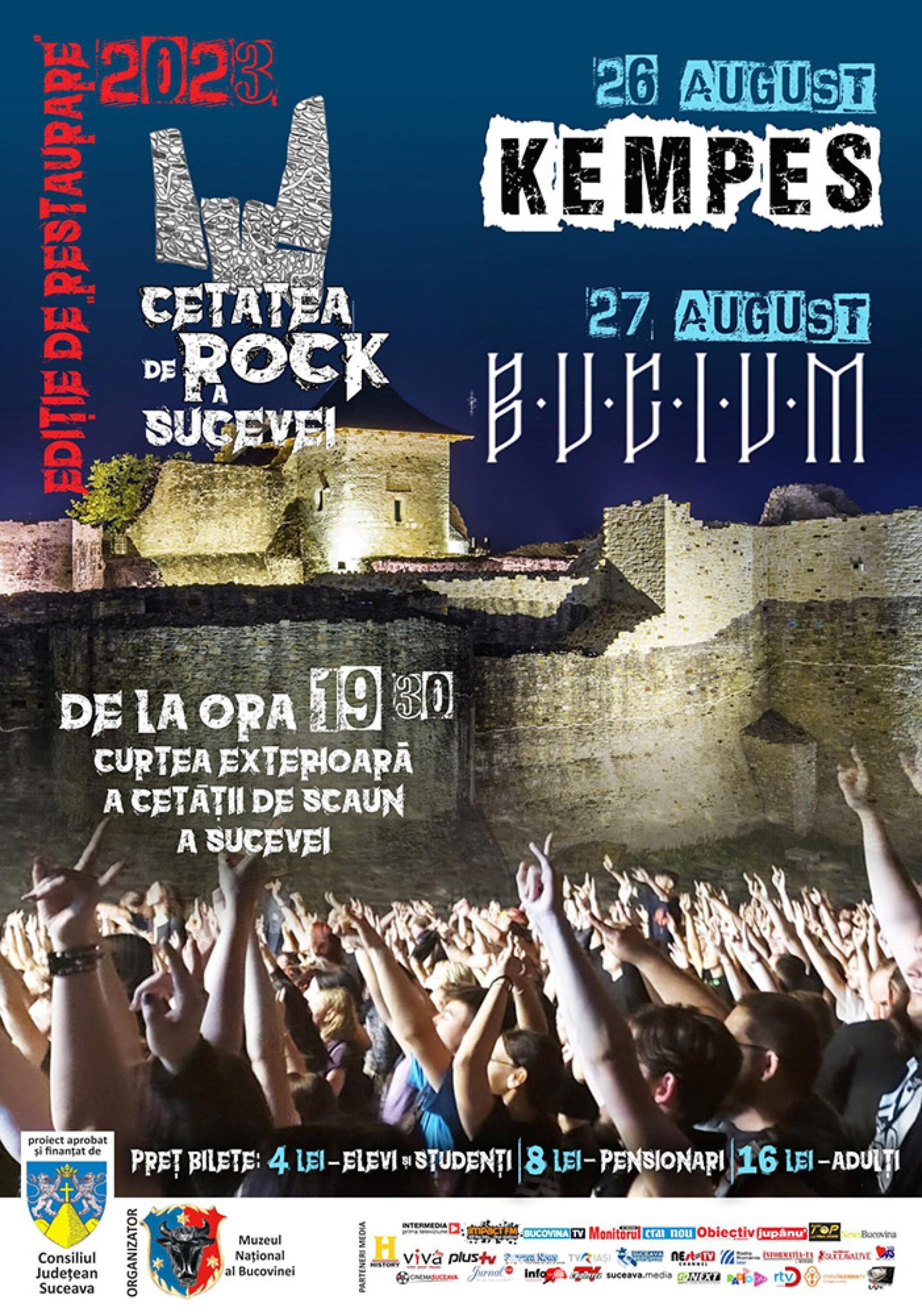 În zilele de 26 și 27 august 2023, muzica rock va răsuna de pe zidurile Cetății de Scaun a Sucevei, de pe bastionul de apărare, iubitorii genului fiind așteptați în curtea exterioară. Anul acesta, organizatorii vă invită la două concerte susținute de KEMPES, pe 26 august 2023, de la ora 19:30, și BUCIUM, pe 27 august 2023, tot de la ora 19:30. Prețul biletelor: 16 lei – adulți,8 lei – pensionari, 4 lei – elevi/studenți. Biletele se pot achiziționa direct de la Casa Custodelui a Cetății de Scaun a Sucevei în ziua concertelor, sau online de pe: https://booktes.com/bilet/cetatea-de-scaun-a-sucevei .