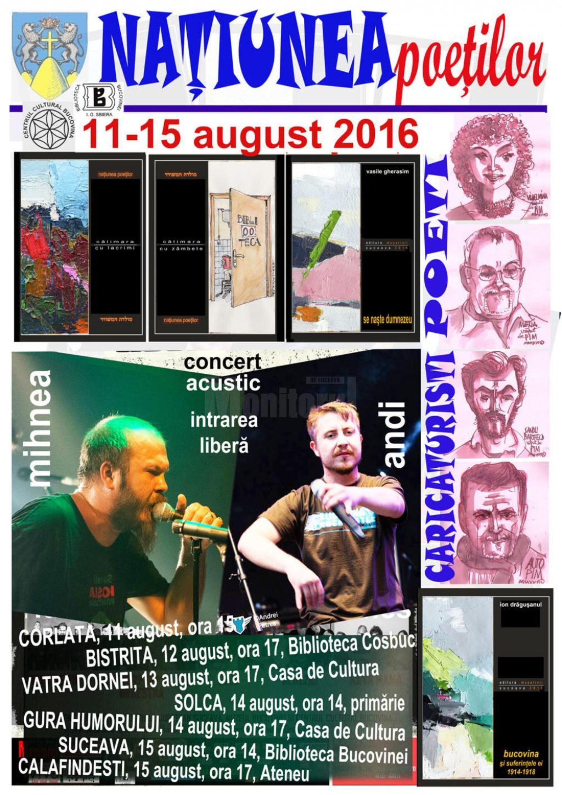 „Națiunea Poeților”, manifestarea organizată de Consilul Județean Suceava, Centrul Cultural Bucovina și Biblioteca Bucovinei „I.G. Sbiera” readuce în acest an sub umbrela prieteniei poeți, caricaturiști și muzicieni care se vor întâlni cu publicul pe un itinerariu afectiv care include localitățile Corlata (Căminul Cultural, 11 august, ora 15.00), Bistrița (Biblioteca Județeană „George Coșbuc”, 12 august, ora 17.00), Vatra Dornei (Casa de Cultură „Platon Pardău”, 13 august, ora 17.00), Solca (Primărie, 14 august, ora 14.00), Gura Humorului (Casa de Cultură, 14 august, ora 17.00), Suceava (Biblioteca Bucovinei „I.G. Sbiera”, 15 august, ora 14.00) și Calafindești (Ateneul Cultural, 15 august, ora 17.00).