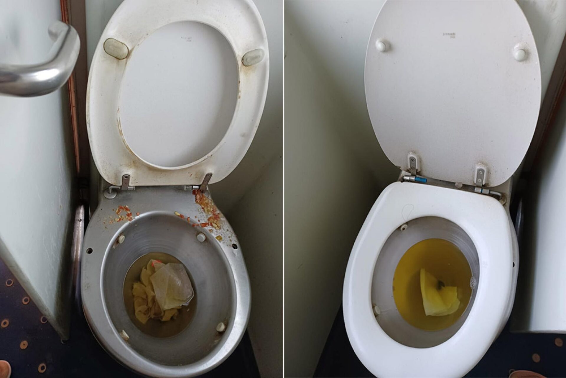 Călătorii au fost nevoiți să își folosească telefoanele mobile pentru a lumina cât de cât în vagoanele în care au urcat în așteptarea locomotivei. Toaletele vagonului cu numărul trei arată ca în imaginile atașate. Adică nefuncționale și pline de fecale și urină. Și asta de la plecare, nu de pe traseu. Ce spuneți, domnule ministru Drulă? Ați călători cu așa ceva? La vagonul numărul unu o toaletă era încuiată și una funcțională. Adică la două vagoane, o singură toaletă. Și asta pentru o călătorie de aproape 6 ore.