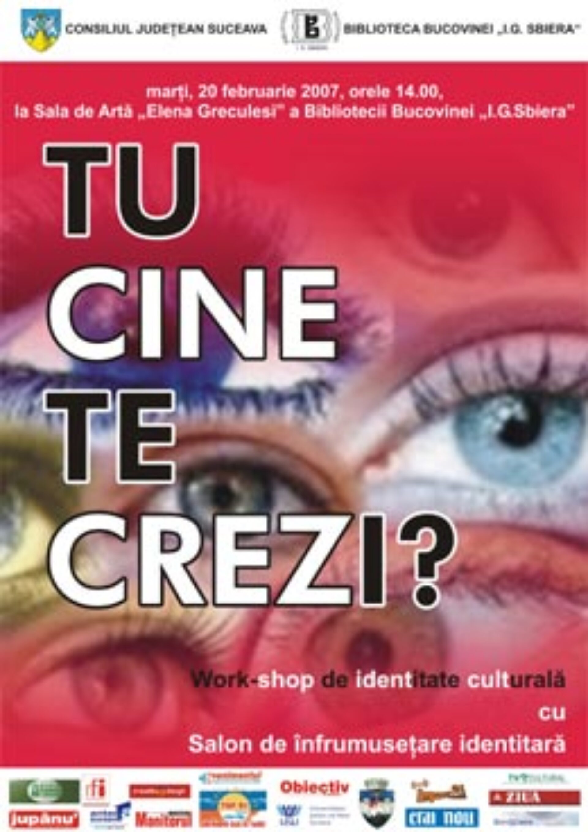 În Sala de artă „Elena Greculesi” a Bibliotecii Bucovinei „I.G. Sbiera” se deschide marți, la ora 14:00, sub genericul „Tu cine te crezi?” primul…”Salon de frumusețe identitară”. Manifestarea, la care vor participa ca protagoniști reprezentanți ai diverselor organizații ale minorităților, profesori, sociologi, psihologi, jurnaliști, reprezentanți ai centrelor comunitare UE, elevi, studenți, „tineri neliniștiți, seniori nedumeriți, adulți fără frontiere, cu cățel, cu purcel, cu motănel…” – cum consemnează în invitație organizatorii – se înscrie în Programul de Educație Antidiscriminatorie al bibliotecii sucevene și va funcționa după principiul „Nimeni nu-i ca mine, dar nici cu tine nu mi-e rușine”. Intrarea, așa cum ni se spune, va fi „în sfârșit liberă; liberă de prejudecăți, liberă de ostilități, liberă de cenzură!!!”. Provocarea lansată participanților este multiplu interogativă: „Avem ceva mai bun de făcut? Avem ceva de câștigat? Avem…cu ce? Problema identității europene, ca identitate comună, se cuvine supusă dezbaterii. „Chestiunea existenței unei identități europene – ne spun manifestării – este departe de a fi reductibilă la moștenirea unui patrimoniu comun…Europeanul poate apărea pe scena istoriei și ca un martor la o victorie și ca un martor la un eșec. E de datoria noastră să-l așteptăm, construindu-l. Avem ceva mai bun de făcut ?”.