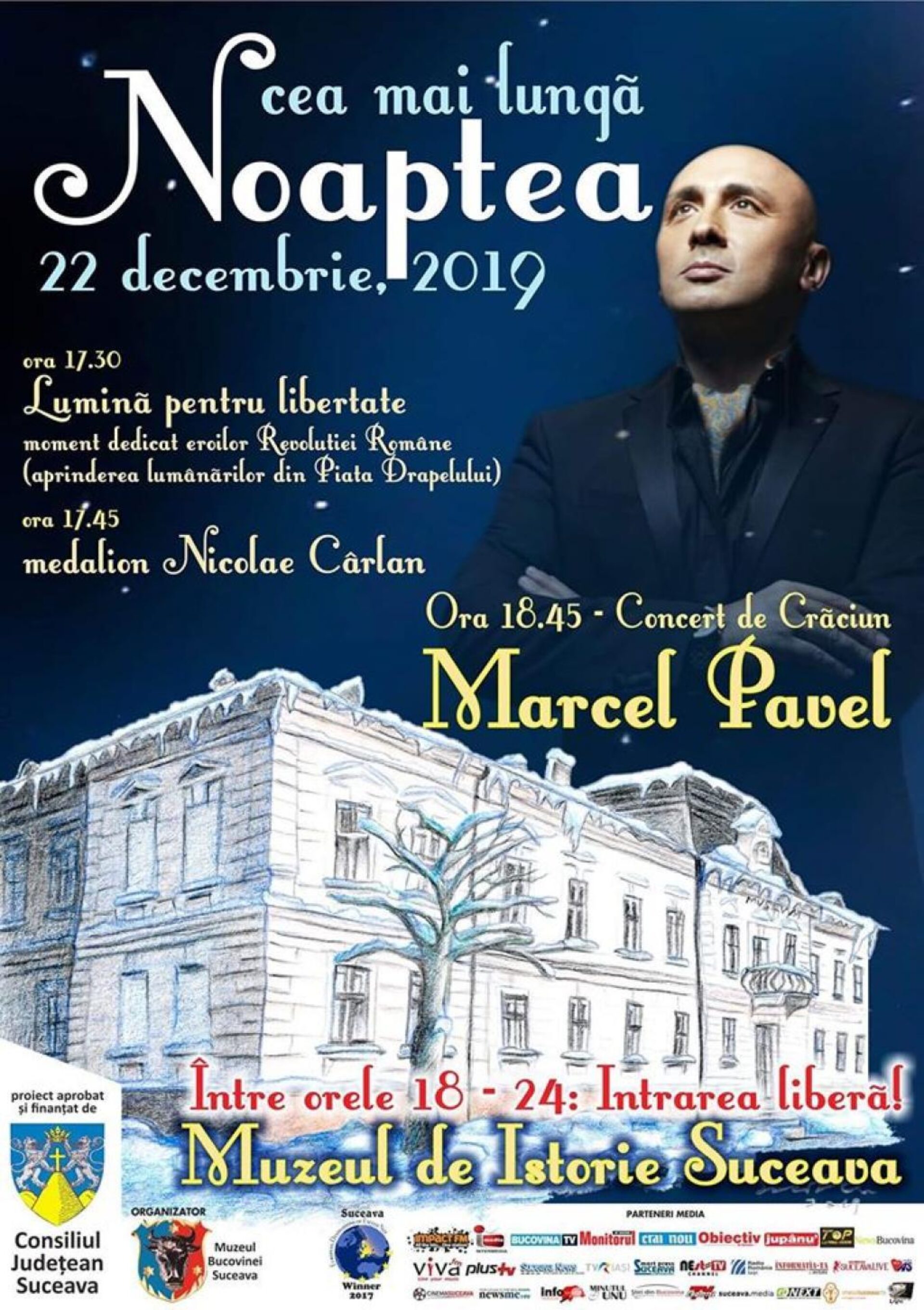 Noaptea cea mai lungă, duminică, 22 decembrie 2019, va avea loc la Muzeul de Istorie Suceava începând de la ora 18 și până la ora 24. Invitatul special va fi Marcel Pavel, care aduce în fața sucevenilor un Concert de Crăciun, începând cu ora 18.45.