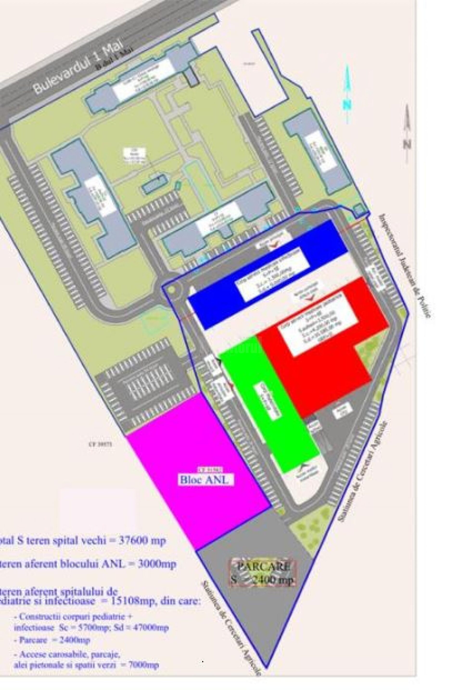 Într-o schiță a amplasamentului din spatele Spitalului Vechi sunt reprezentate, cu culoarea albastră noul Spital de Boli Infecțioase, cu roșu Spitalul de Servicii Medicale pentru Copii, clădirea reprezentată cu verde fiind sediul noii Maternități ce urmează a fi ridicată. Cu roz a fost reprezentat blocul medicilor aflat deja în construcție spre finalizare, complexul fiind prevăzut și cu spații de parcare care ocupă în final întreaga suprafață disponibilă.