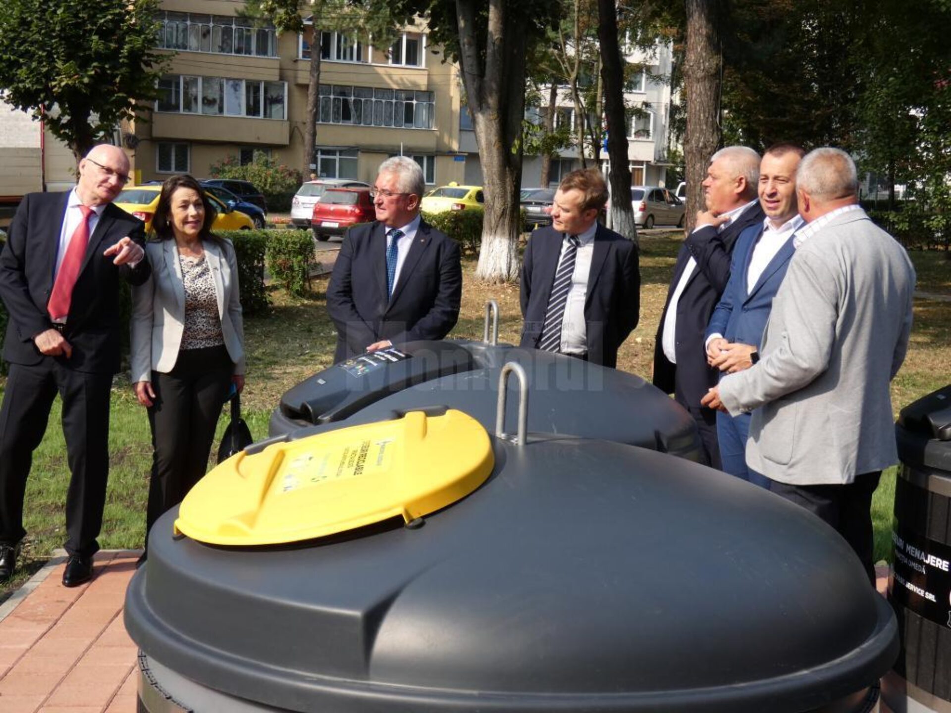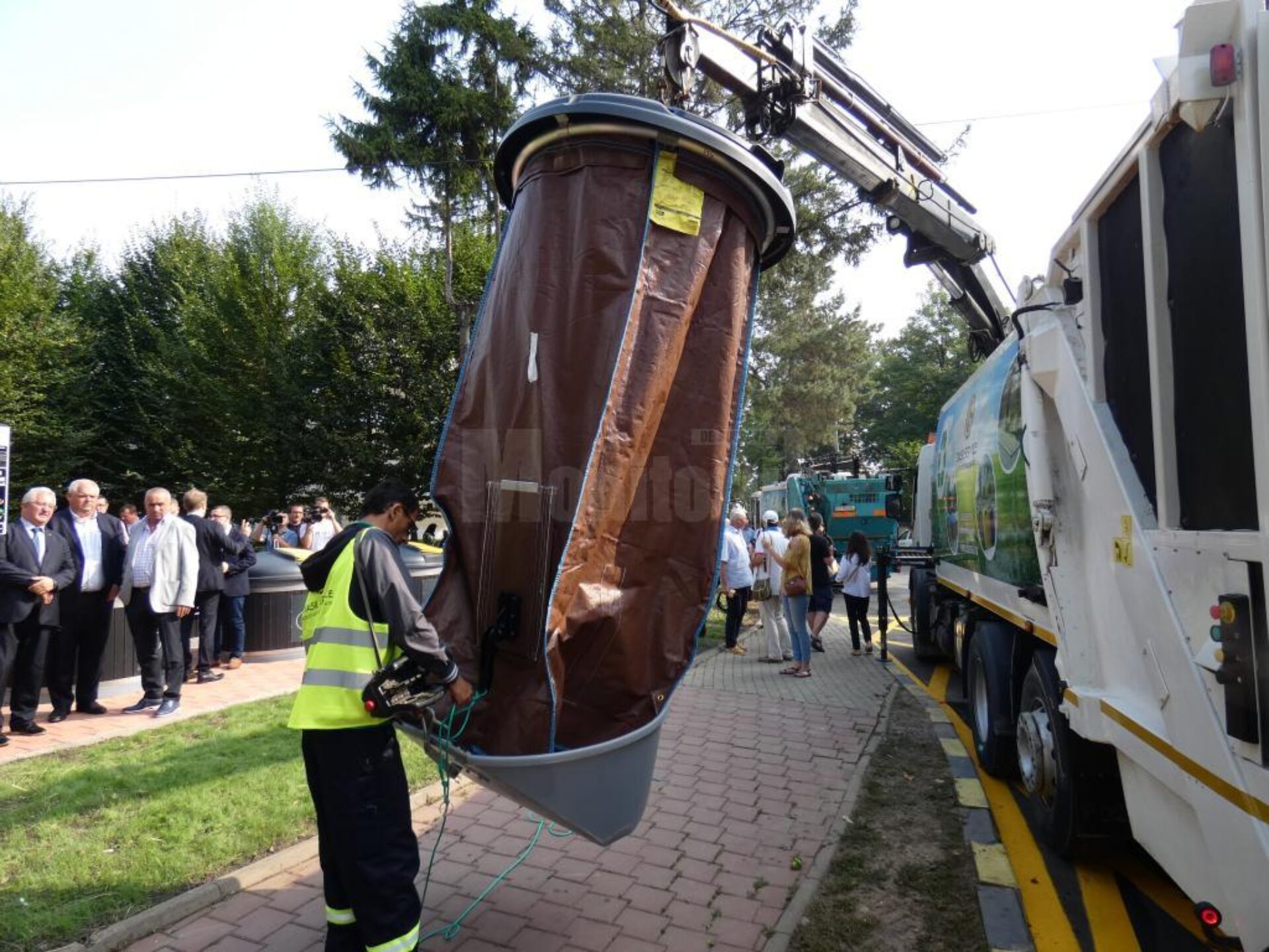 Invitații de peste hotare, reprezentanții administrației locale dar și sucevenii din zona străzii Ion Vodă Viteazul, lângă Mănăstirea Sfântul Ioan, unde a fost realizat primul punct de colectare semiîngropat, au asistat la o demonstrație de manevrare a noilor echipamente, golirea containerele fiind făcută cu autospeciala dotată cu braț mecanic.