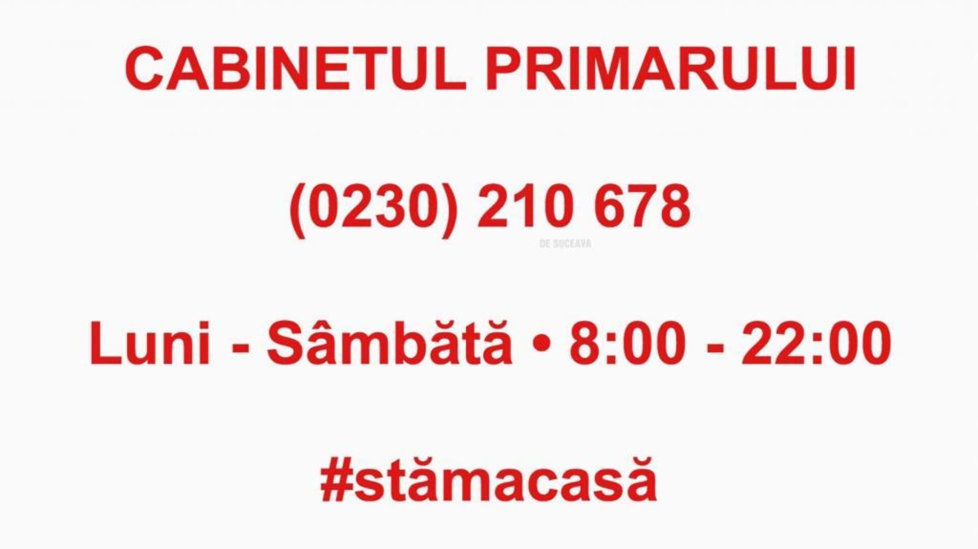 “De astăzi începe o perioadă destul de grea, având în vedere că își produc efectele Ordonanțele Militare prin care se limitează deplasările. Primăria Municipiului Suceava a pus la dispoziție un număr de telefon direct, de la cabinetul primarului, DESTINAT EXCLUSIV CETĂȚENILOR MUNICIPIULUI SUCEAVA – 0230 210 678, la care se pot ridica probleme legate de noul coronavirus (COVID -19). Linia este funcțională între orele 8:00 – 22:00, de luni până sâmbătă inclusiv.