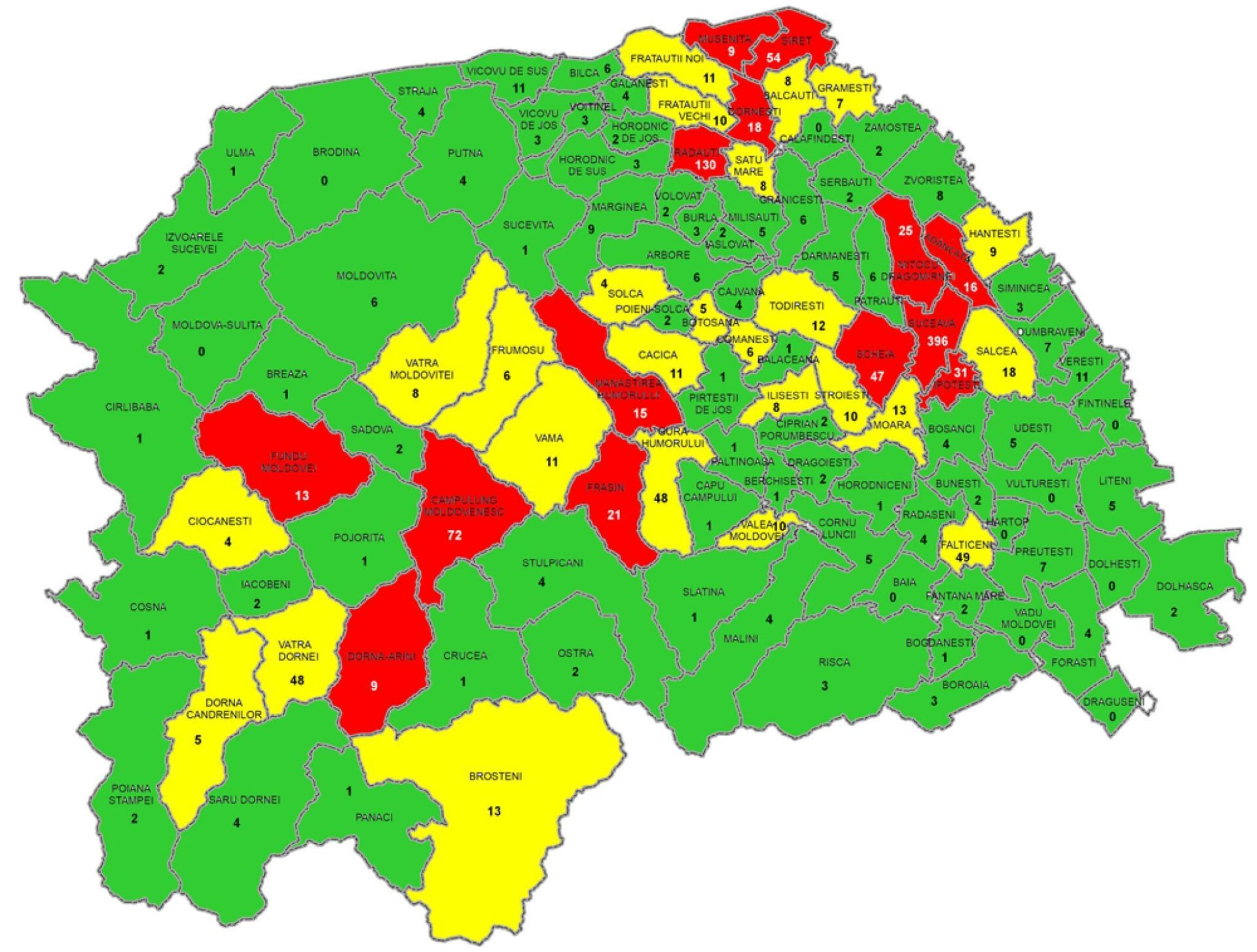 Județul Suceava are 14 localități în zona roșie, din punct de vedere al numărului de cazuri active de infectare cu noul coronavirus. Cele mai multe sunt în municipiul Suceava – 396 de cazuri în evoluție, apoi în Rădăuți, cu 130 de cazuri, Câmpulung Moldovenesc, cu 72 de cazuri, Siret, cu 54 de cazuri, și Șcheia, cu 47 de cazuri în evoluție. Urmează Ipotești – cu 31 de cazuri, Mitocu Dragomirnei – 25 de cazuri, Frasin – 21 de cazuri, Dornești – 18 cazuri, Adâncata – 16 cazuri, Mănăstirea Humorului – 15 cazuri, Fundu Moldovei – 13 cazuri, Dorna Arini și Mușenița – câte 9 cazuri în evoluție.