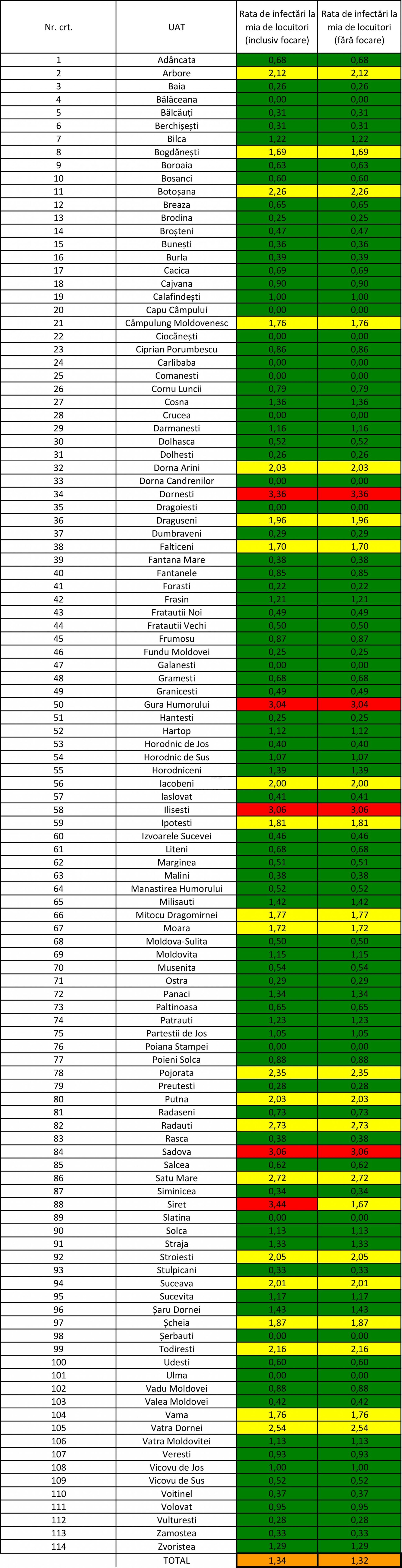 Incidența cazurilor pozitive în municipiul Suceava este de 2,01 la mie, mai redusă decât marți, când a fost 2,09 la mie. În Siret incidența cu focare este de 3,44 la mie și de 1, 67 la mie fără focare.