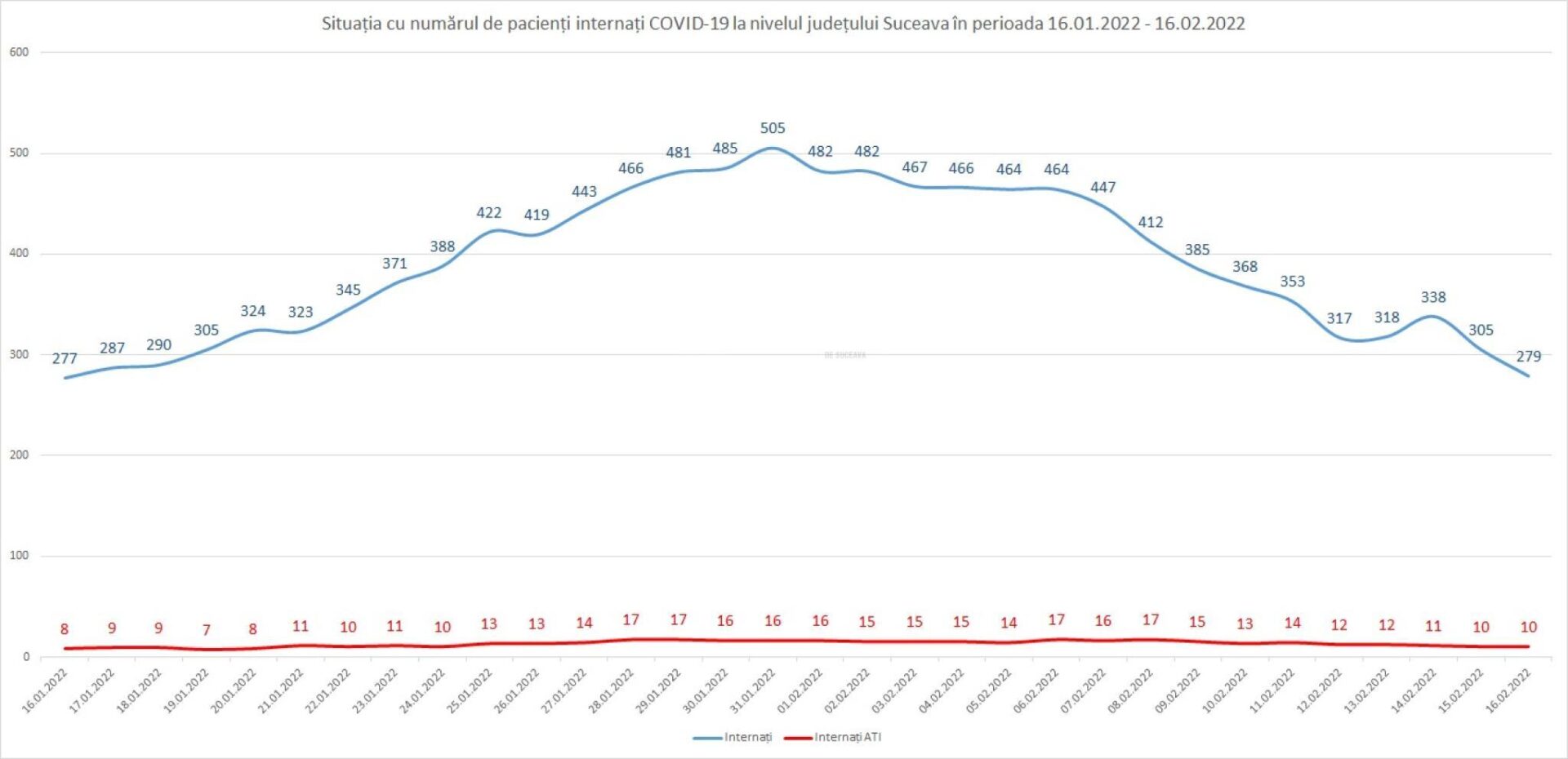 O veste bună pentru județul Suceava este că numărul pacoienților cu forme grave de Covid-19 care au nevoie de terapie intensivă a scăzut constant și de două zile este la nivelul din 24 ianuarie, respectiv 10 pacienți. Patru dintre ei sunt intubați. În spitalele din județ sunt internați la această dată 279 de de suceveni cu Covid, din care 10 copii, potrivit buletinului de presă de miercuri, de la ora 13.00, remis de Prefectura Suceava..
