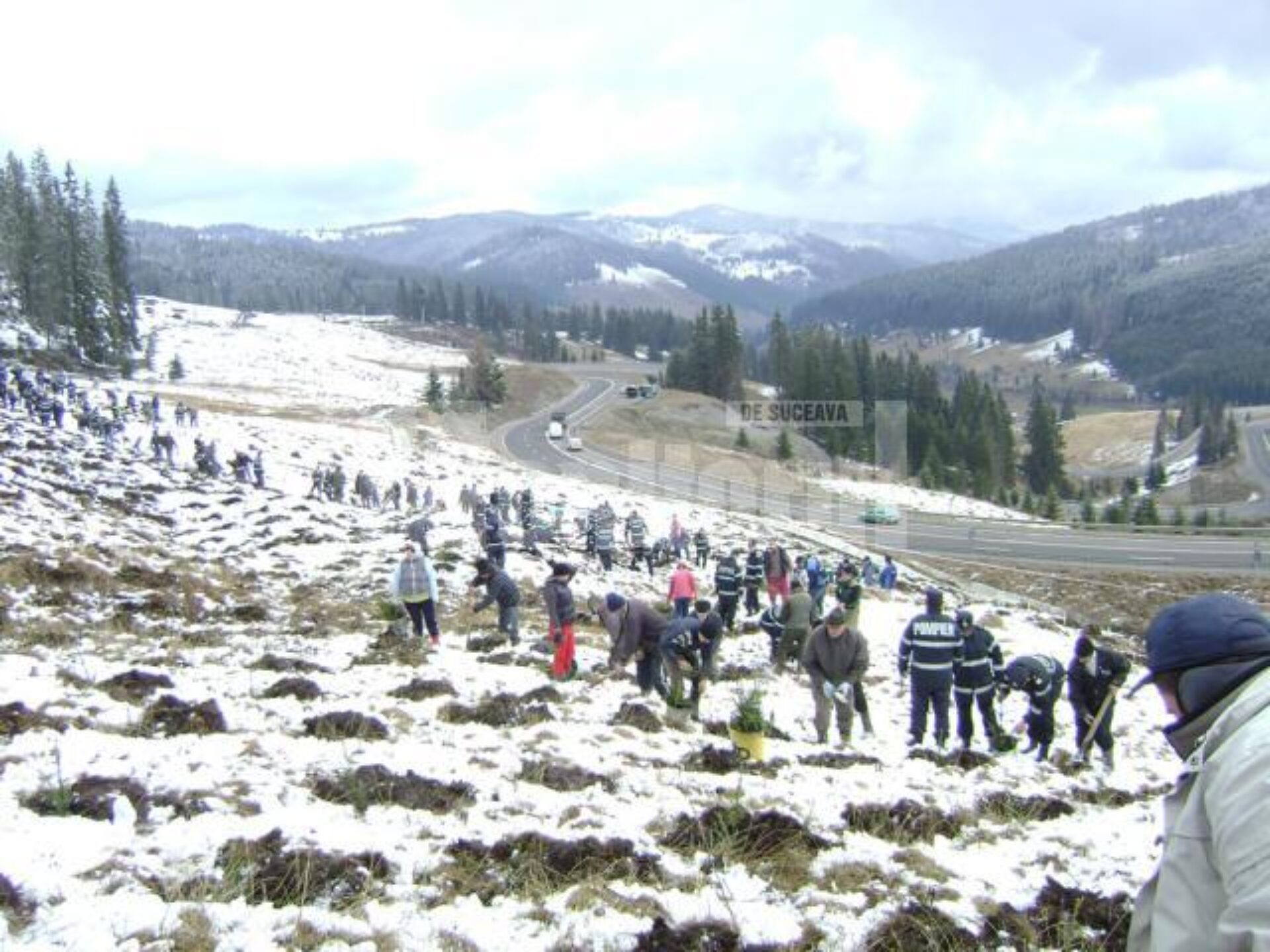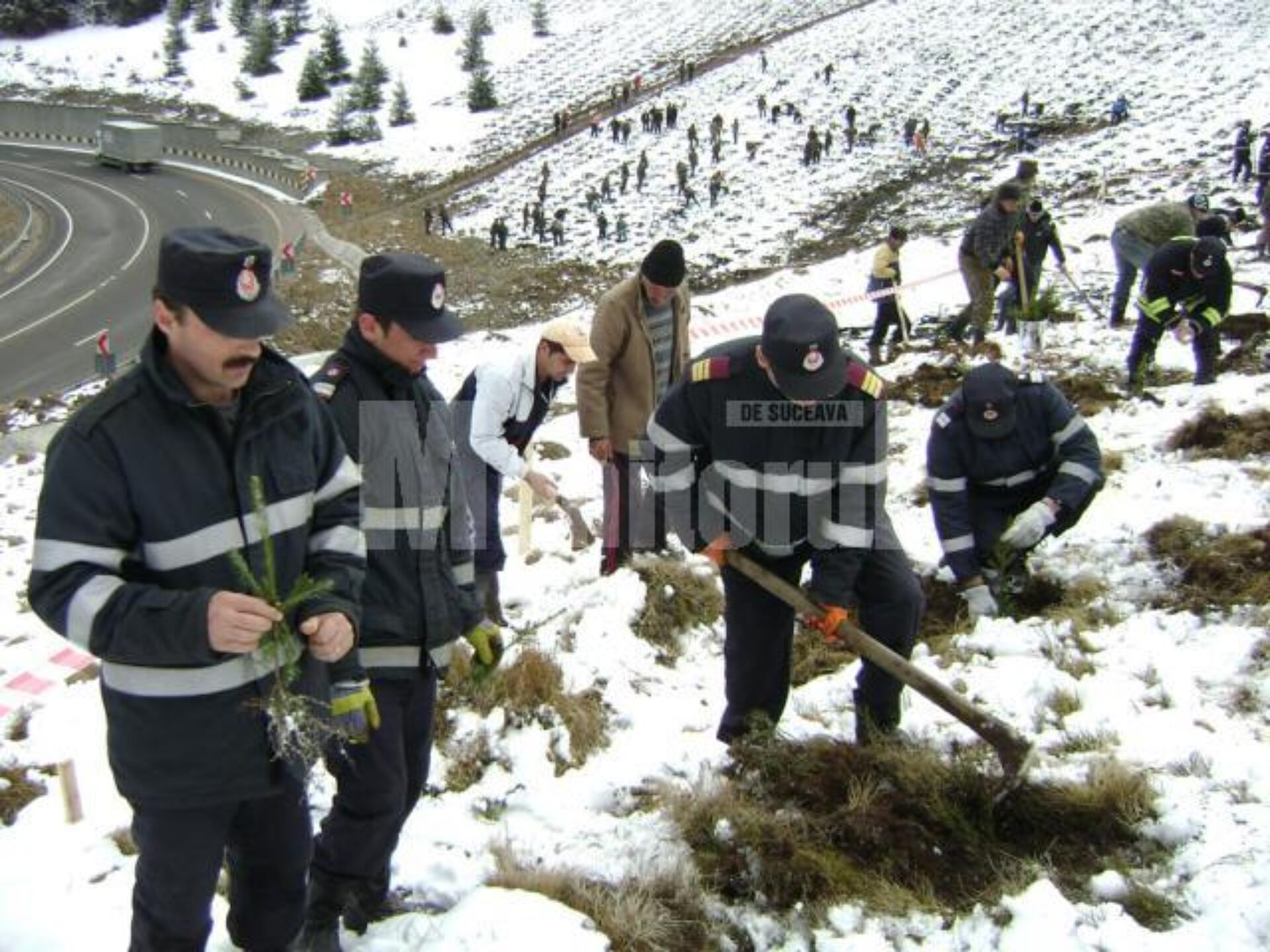 Sute de silvicultori, cadre ale Inspectoratului pentru Situații de Urgență Suceava și voluntari au participat, ieri, la o acțiune de împădurire cu molid a aproximativ două hectare pe Mestecăniș, acțiune înscrisă în cadrul campaniei „Luna Plantării Arborilor” a Regiei Naționale a Pădurilor.