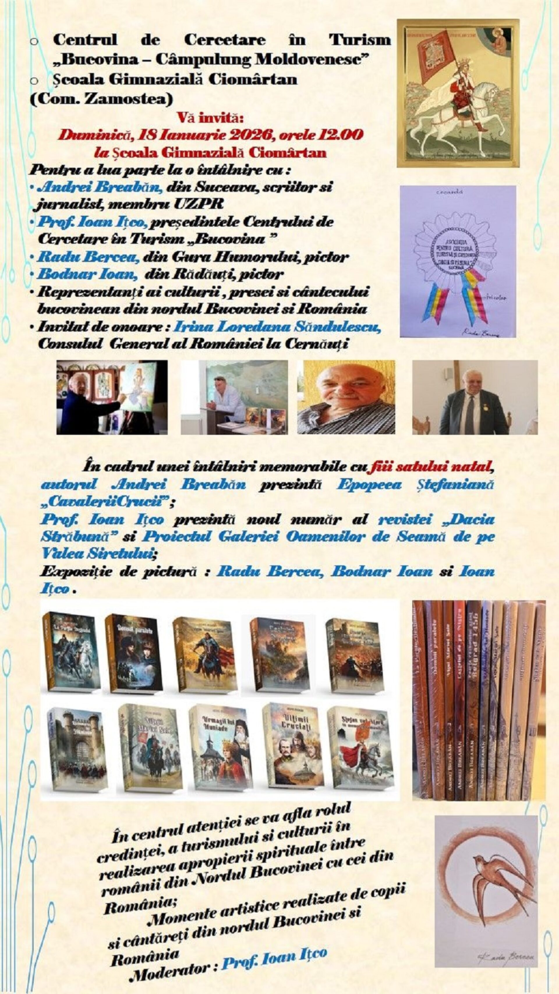 Un loc aparte în organizarea evenimentului îl are profesorul Ioan Ițco, un om cu un suflet generos, care la începutul carierei a fost cel mai tânăr director de școală din țară ca apoi să devină cel mai bun specialist în turism la nivel național, un prieten devotat al oamenilor de cultură și de afaceri atât din nordul Bucovinei unde se simte ca acasă, cât și în România, fiind preocupat de identificarea și promovarea valorilor, a oamenilor de seamă din toate domeniile, pe care nu numai că îi scoate la lumină, dar le oferă sprijin pentru a fi cunoscuți atât la nivel regional cât și în toată țara. Pe lângă activitățile culturale și în turism la care ia parte, profesorul Ioan Ițco scoate două reviste prețioase, Dulce Bucovină și Dacia Străbună, în care promovează oameni de valoare din nordul și sudul Bucovinei cât și din alte regiuni din România, a adunat bani și s-a ocupat de realizarea de busturi pentru mai multe personalități culturale, este inițiatorul Galeriei Oamenilor de Seamă în care a adus laolaltă reprezentanți ai culturii și mediului de afaceri din România și Ucraina, semn al prieteniei între cele două țări și popoare vecine. Începând cu această zi specială, aflată în preajma aniversării de către românii de pretutindeni a cel puțin trei evenimente remarcabile, nașterea geniului culturii române Mihai Eminescu, victoria de la Vaslui cu care Ștefan cel Mare ridică steagul cruciadei antiotomane și Unirea Principatelor Române sub autoritatea lui Al.I.Cuza, ne-am propus să continuăm manifestările culturale pe toată Valea Siretului, de la izvoare până la vărsarea în Dunăre, următoarea întâlnire urmând s-o realizăm în Siret, la Liceul la care am continuat studiile, unde împreună cu profesorul Ioan Ițco am identificat numeroși oameni de seamă, publicați în noul număr al revistei „Dacia Străbună” pe care îl lansăm la Școala din Ciomârtan alături de nume ale unor personalități din comunele Zamostea și Zvoriștea, cât și din nordul Bucovinei, liste pe care le vom continua în viitoarele numere ale revistei.Prin această acțiune vrem să păstrăm vie amintirea acestor oameni deosebiți care au avut realizări remarcabile pentru spiritualitatea română.