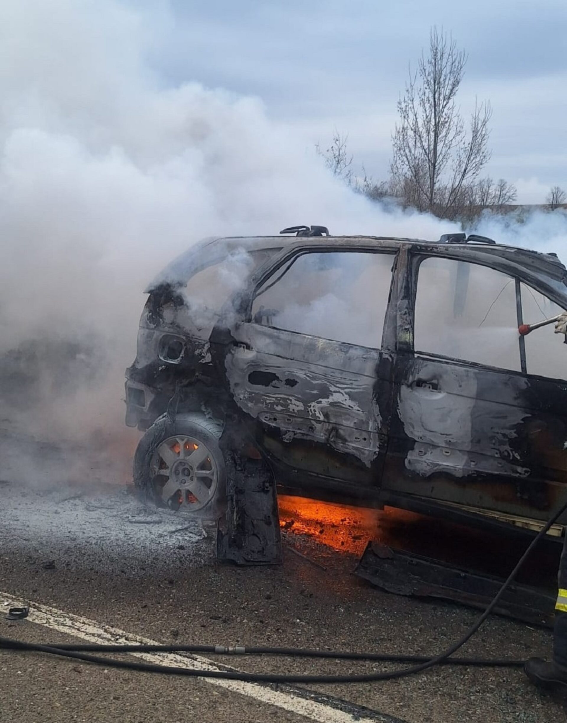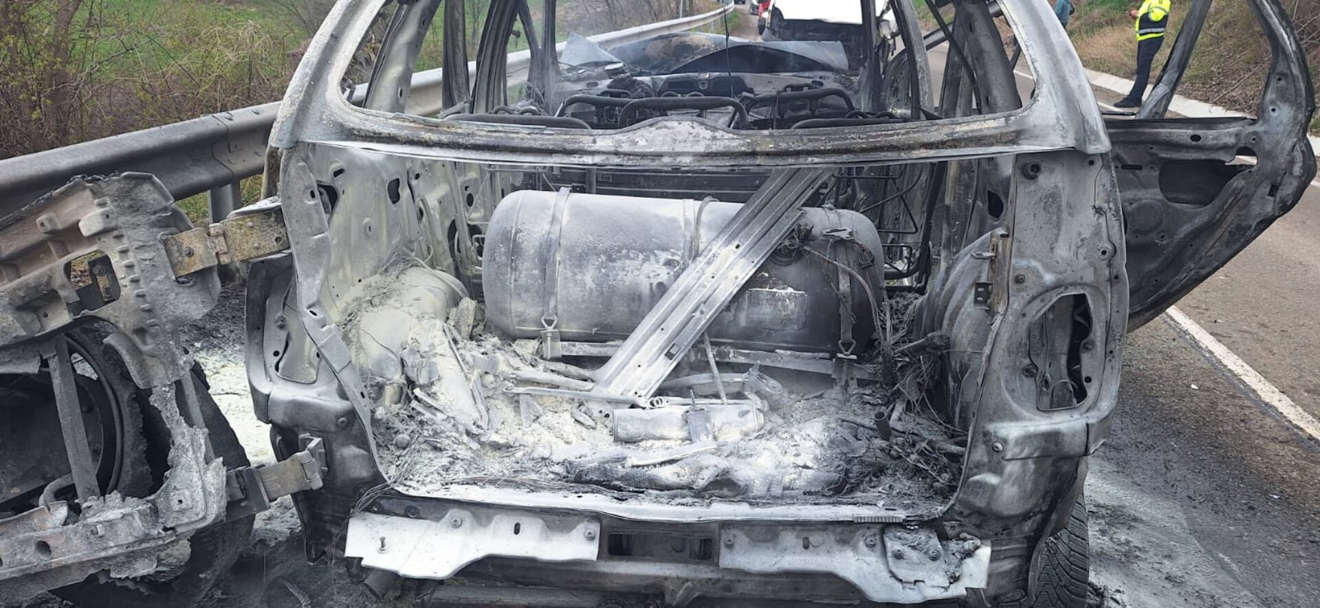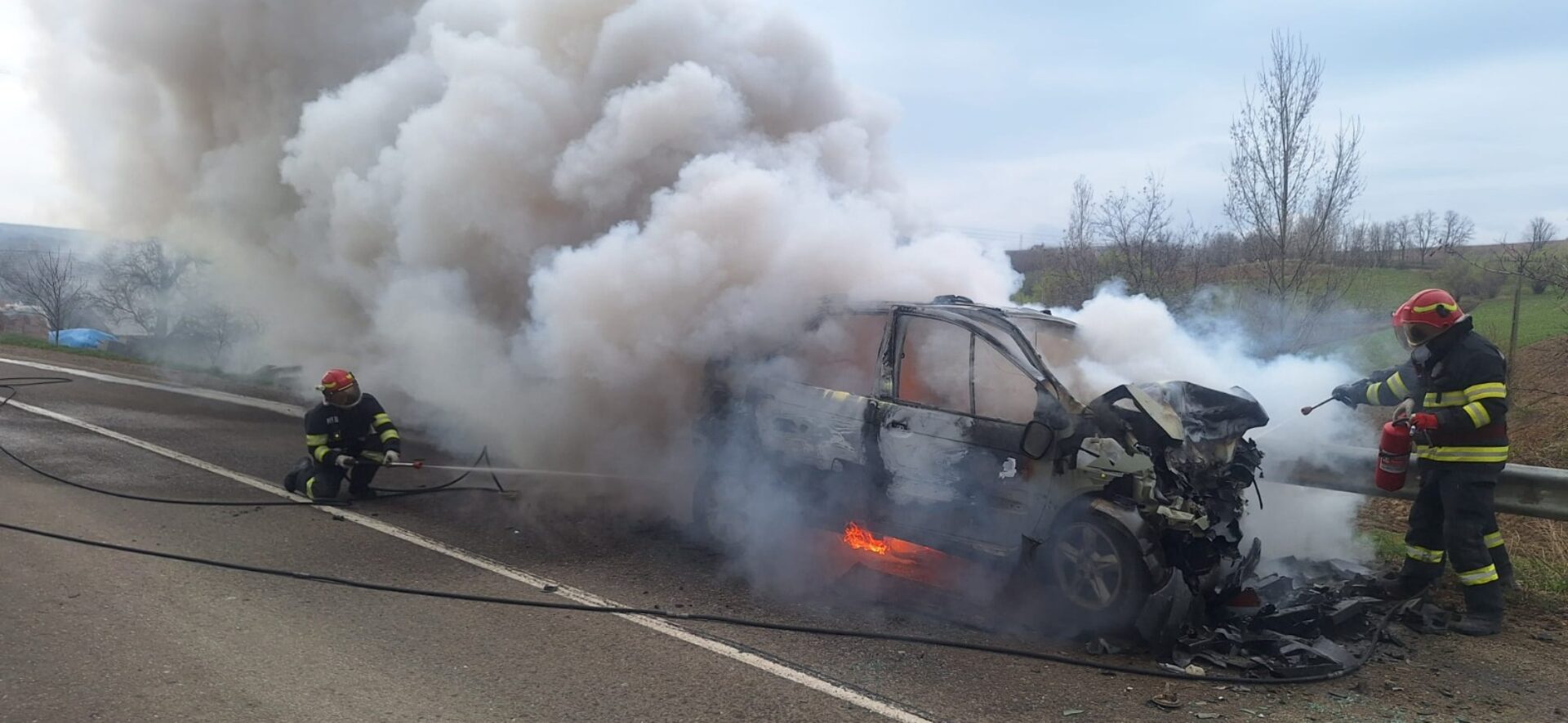 În urma impactului, autoturismul marca Renault, care era alimentat cu GPL, a luat foc și a existat riscul de explozie.
