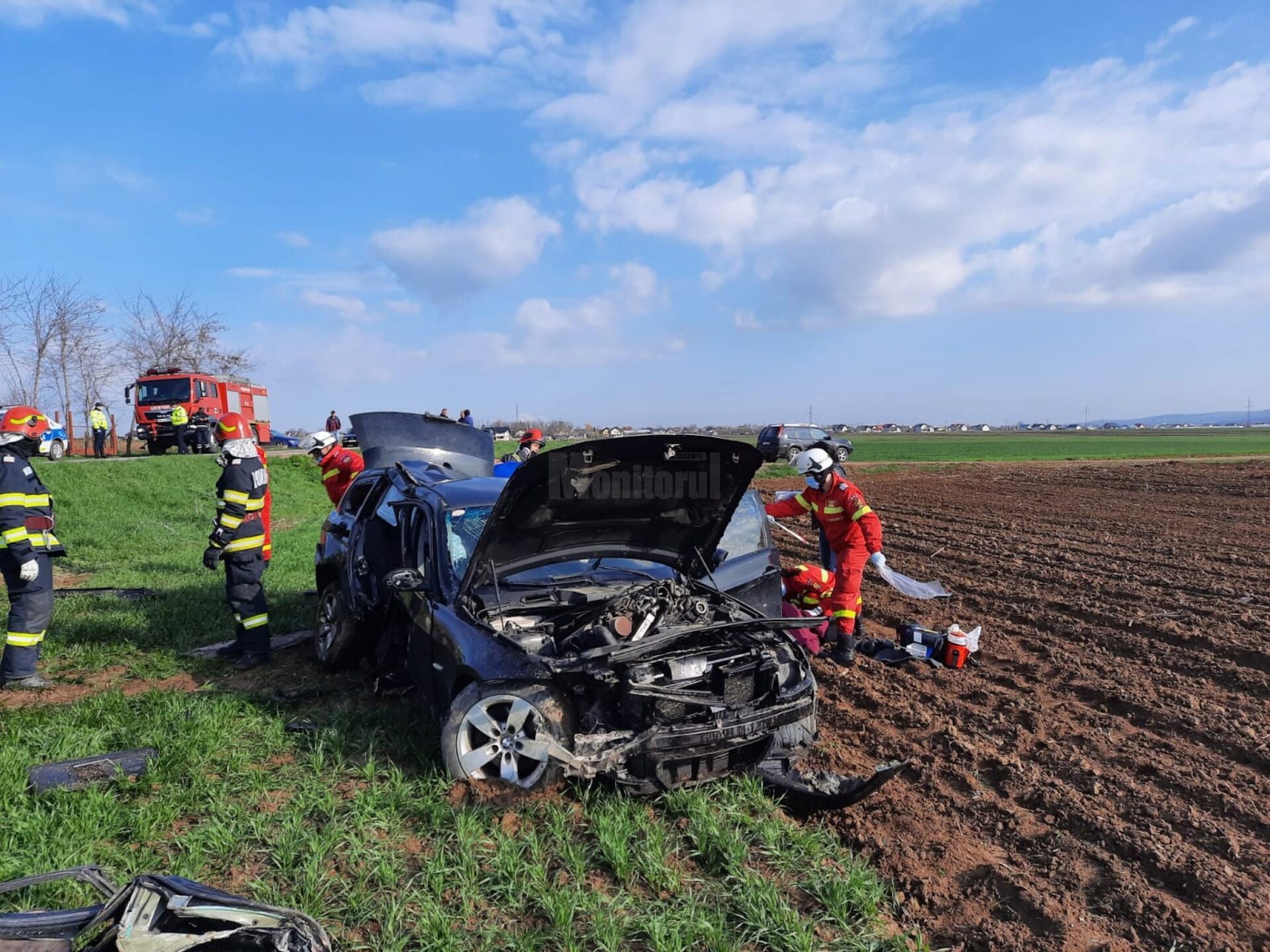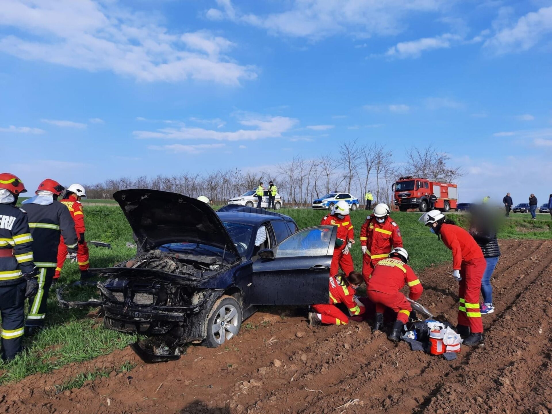 Femeia de la volan a pierdut controlul asupra mașinii, care a intrat într-un cap de pod, după care a fost proiectată pe ogor. În urma impactului violent, la compartimentul motor al mașinii a izbucnit un incendiu. La fața locului au intervenit de urgență pompierii militari cu o autospecială de stingere, una pentru descarcerare și o ambulanță SMURD TIM. La sosirea pompierilor, mașina nu mai ardea iar o femeie era în exteriorul mașinii, având leziuni. Ea a primit îngrijiri medicale de urgență la locul accidentului.