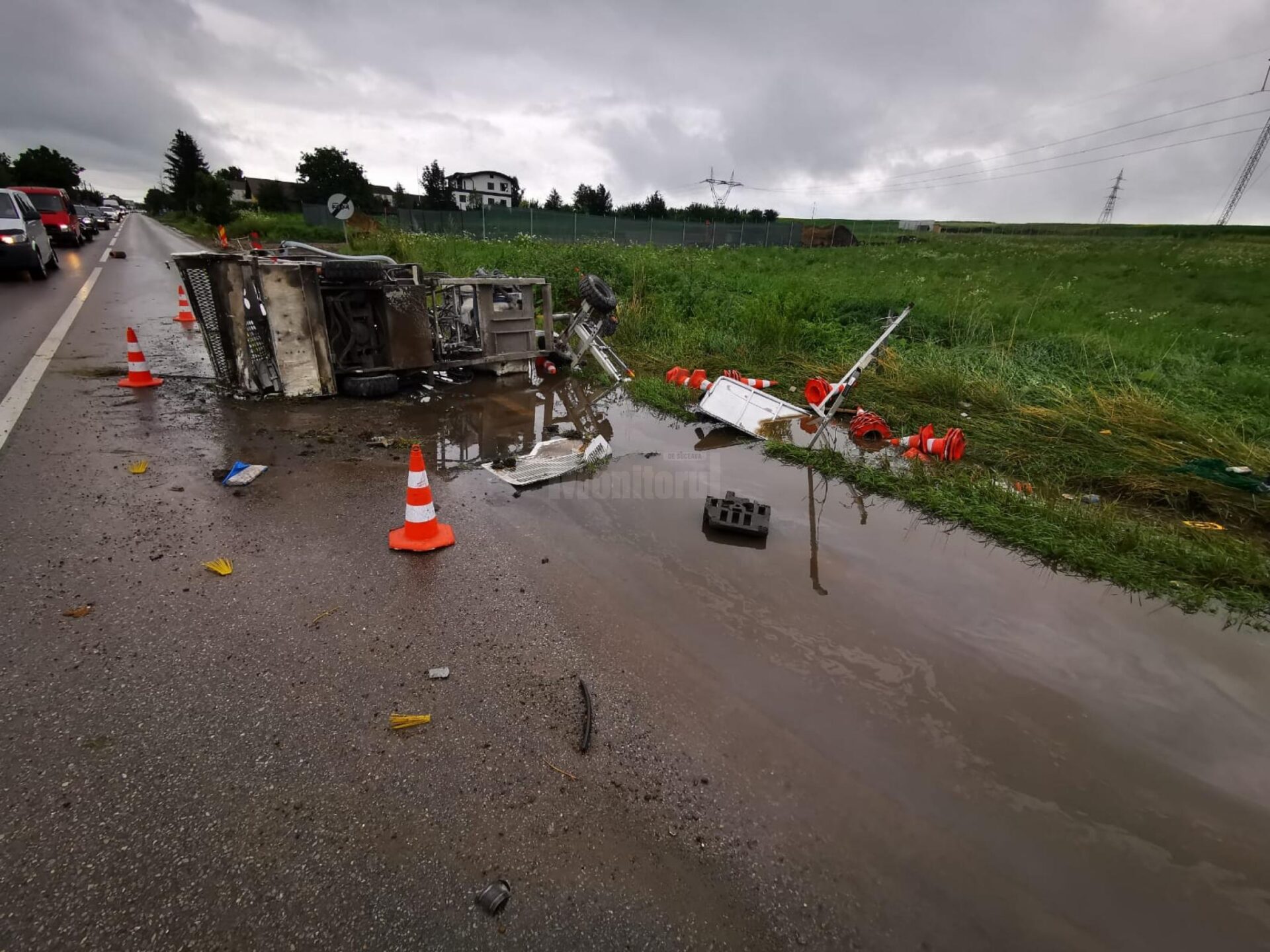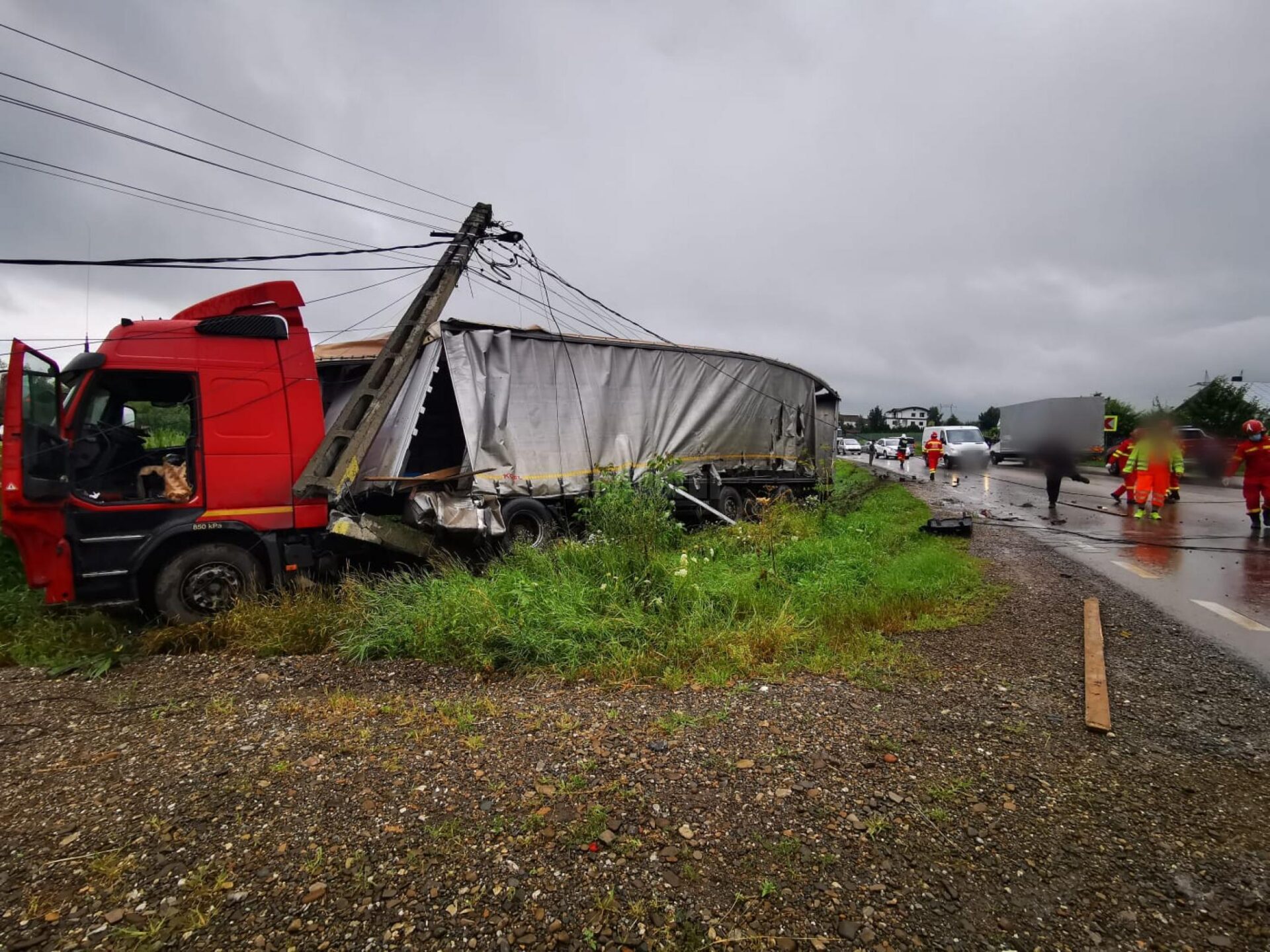 Pompierii militari transmit că, în urma coliziunii, autotrenul a părăsit partea carosabilă și s-a oprit într-un stâlp de pe marginea drumului, aflat într-un lan de porumb, iar utilajul a ieșit în decor, remorca acestuia fiind făcută bucăți, pe partea carosabilă.
