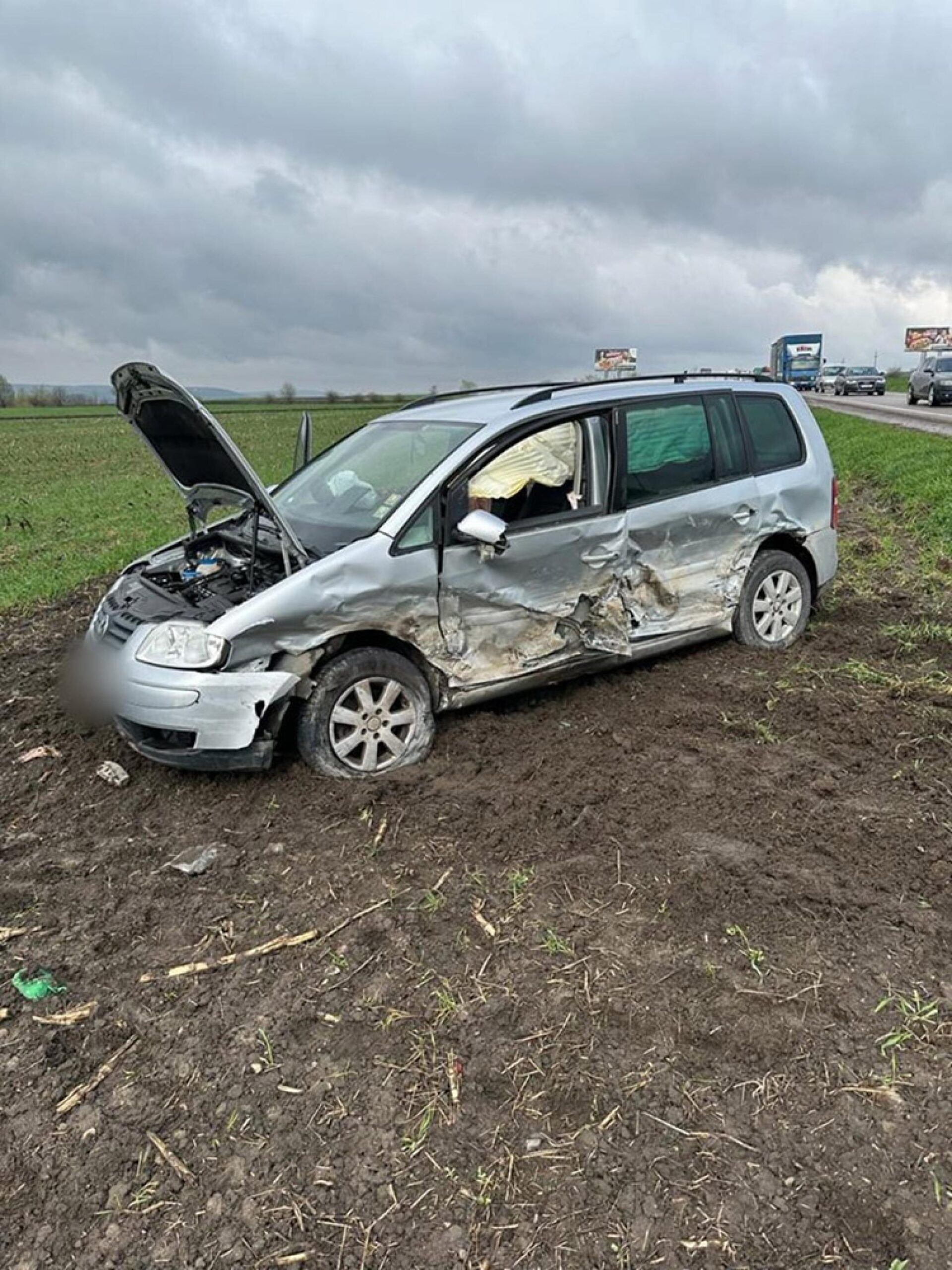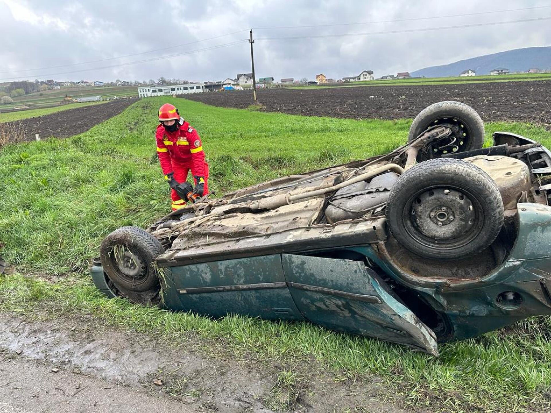 În urma impactului, una dintre mașini s-a răsturnat, iar a doua a ajuns în decor, cu grave avarii în partea laterală stânga.