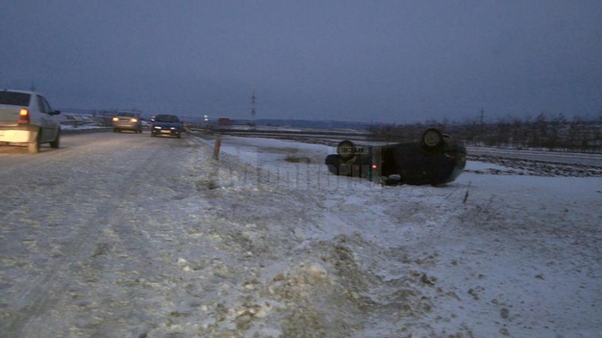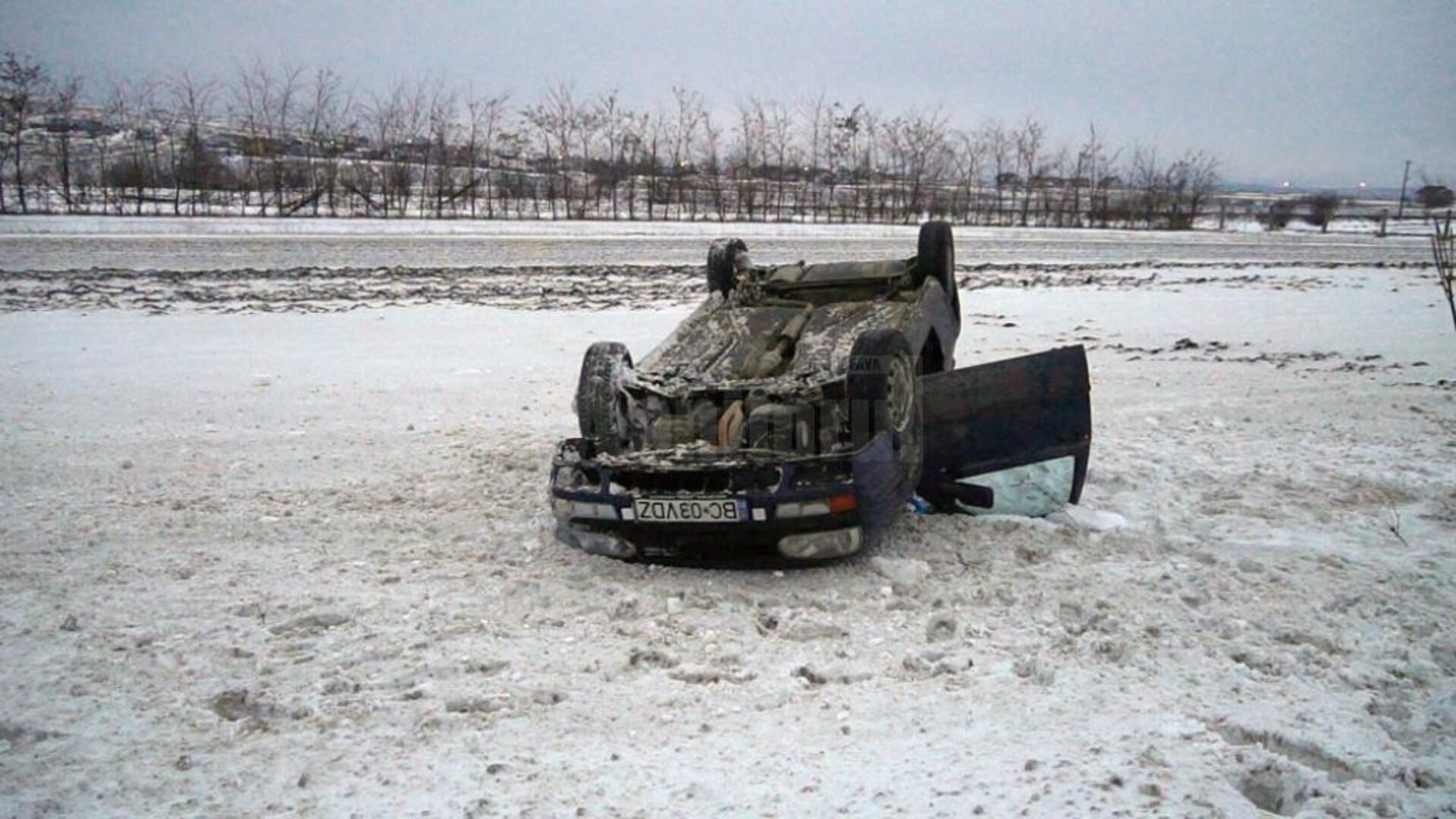 O mașină s-a răsturnat pe DN 17, pe o porțiune acoperită de zăpadă