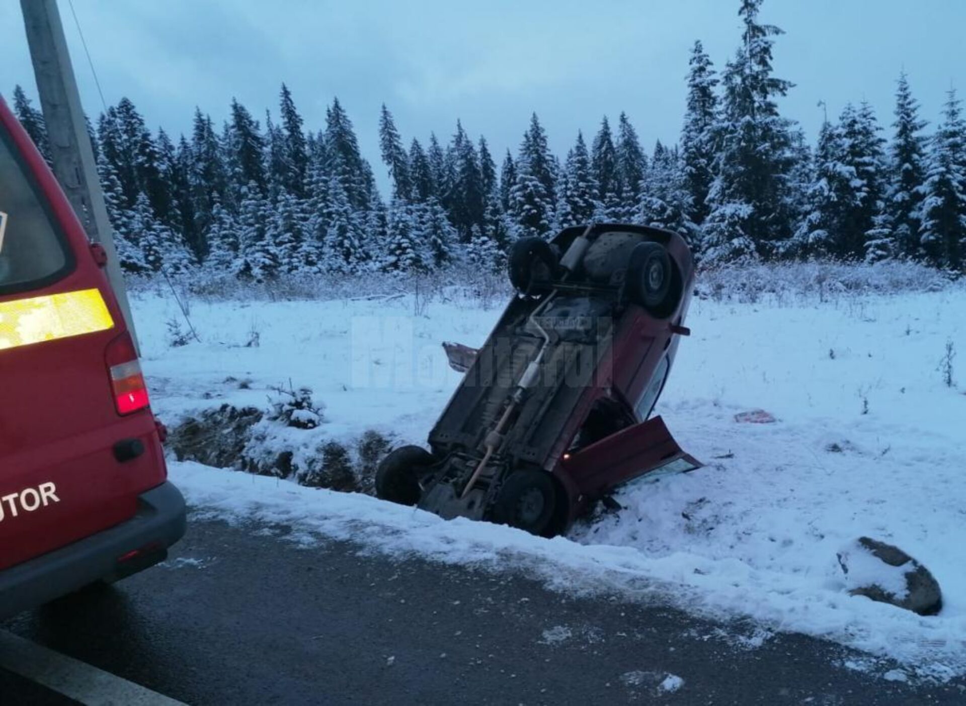 O mașină s-a răsturnat sâmbătă după-amiază la Poiana Stampei. Mașina a ieșit în afara carosabilului și a rămas suspendată cu botul într-un șanț și cu roțile în sus.