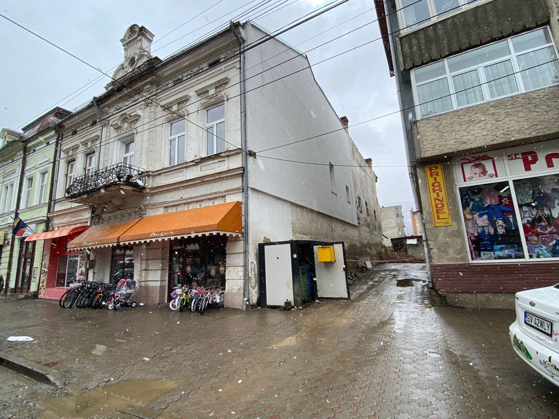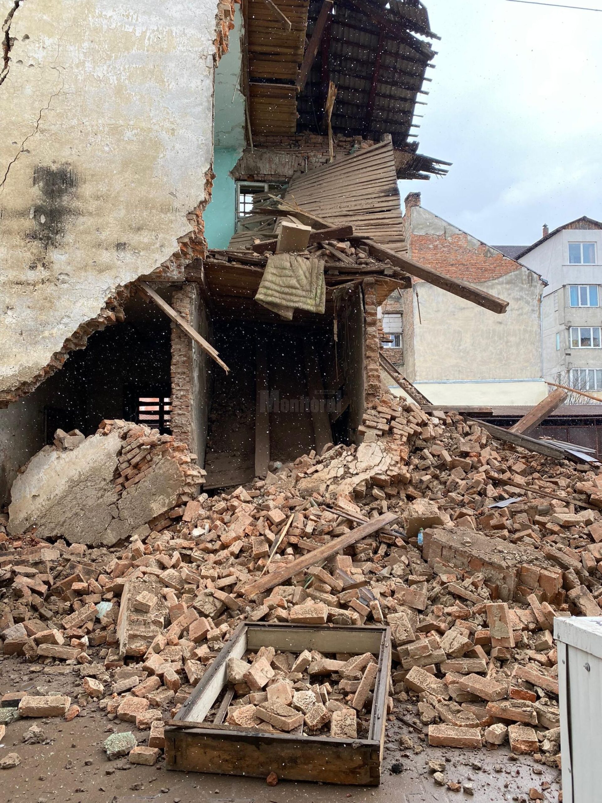 În partea din spate, cea afectată de prăbușire, lucrurile sunt mai complicate. Aici cândva primăria a avut locuințe sociale, dar chiriașii au fost evacuați când au început să apară probleme la structură. Acum parterul aparține firmei care are magazinul din față, iar etajul este al primăriei. Dacă municipalitatea va demola doar partea care îi aparține, ar lăsa fără acoperiș spațiile care sunt ale magazinului, astfel încât ambii proprietari trebuie să cadă de acord asupra lucrărilor de demolare/ consolidare, de salubrizare și de securizare a zonei, care trebuie cât mai rapid efectuate.