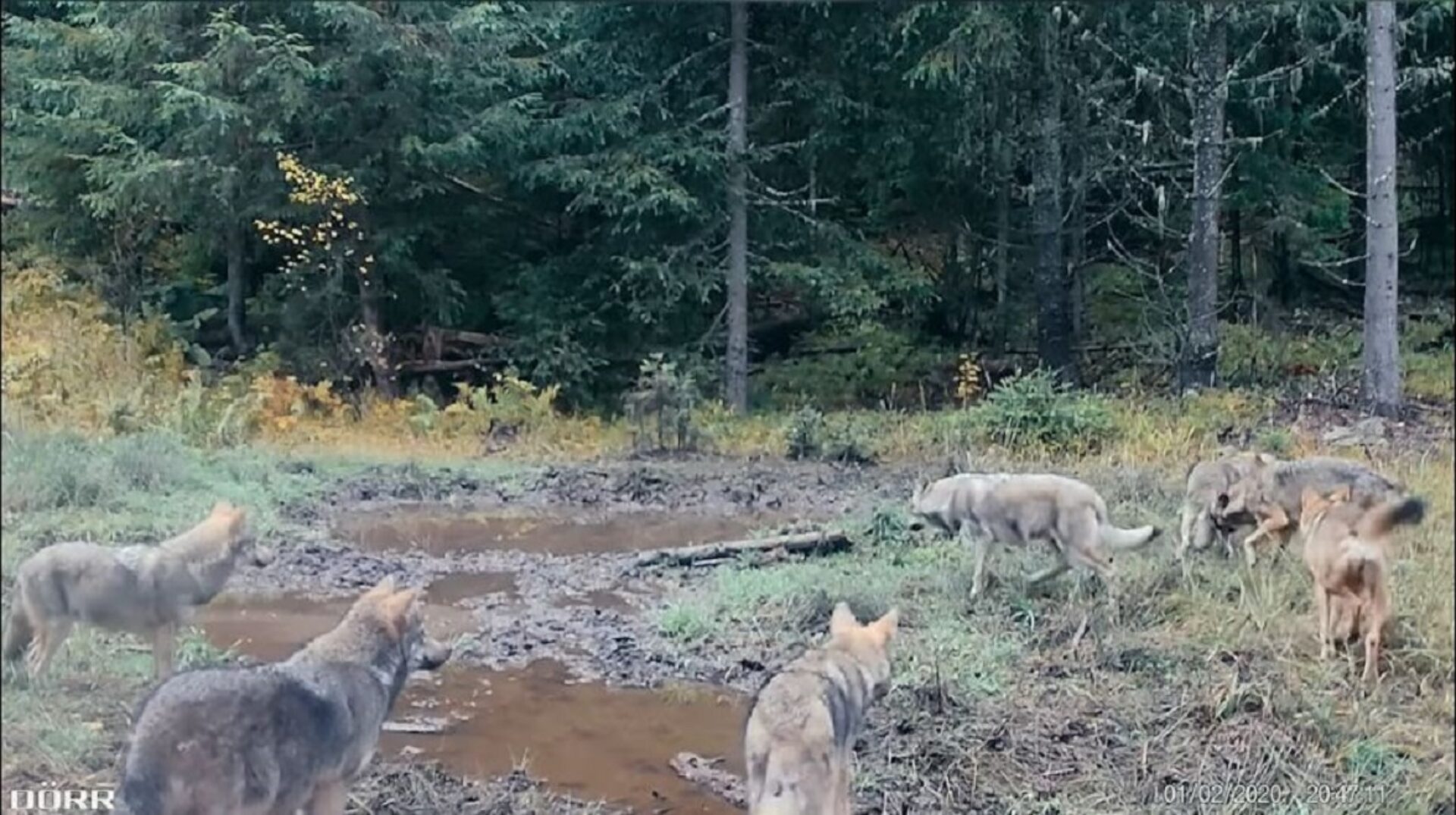 Imaginile superbe cu o haită de lupi din pădurile administrate de Ocolul Silvic Broșteni din cadrul Direcției Silvice Suceava, surprinse cu ajutorul unei camere de monitorizare a faunei instalată de către silvicultorul Ionel Moroșanu, ilustrează un moment din viața acestora, în care merg la un ochi de apă, de unde se adapă.