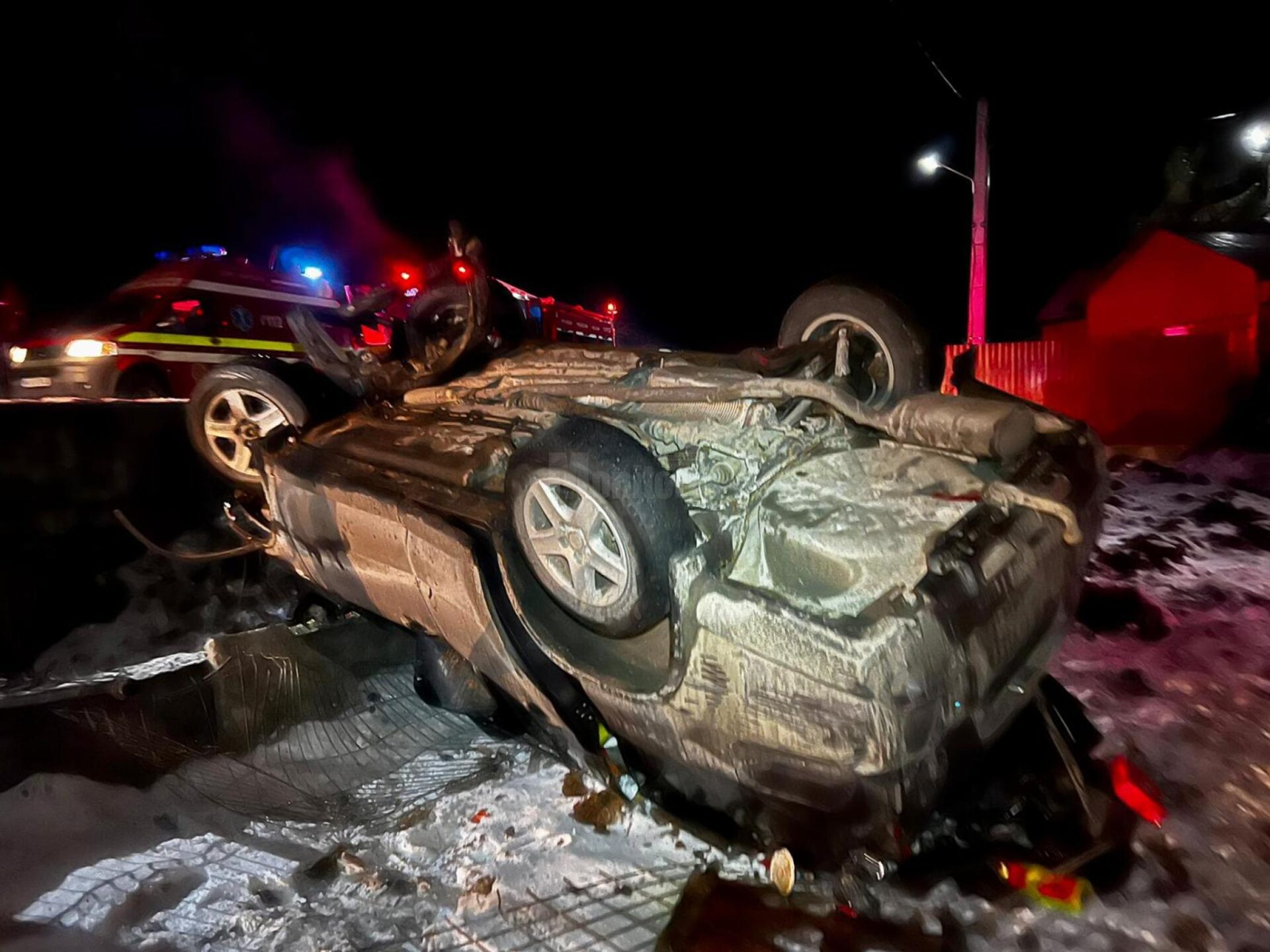 Autoturismul Nissan era răsturnat pe cupolă, în interior fiind doar o femeie, care a fost preluată pentru îngrijiri medicale.