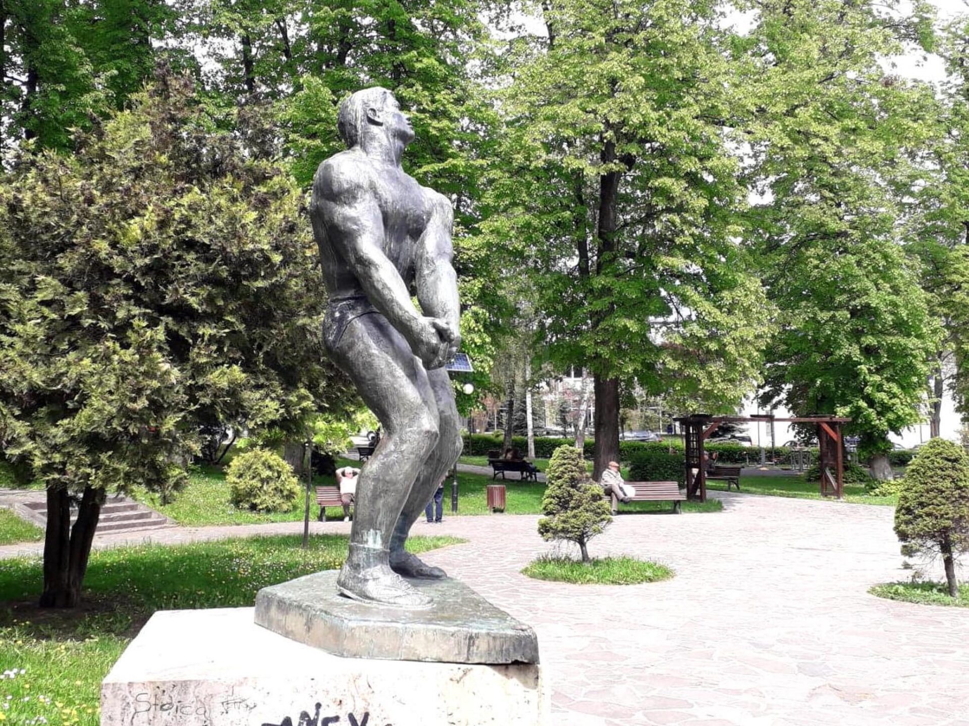 Acum, ar fi cazul să spun și istoria insului cu pricina… Nu prea demult – adică înainte de 1989 – acolo ființa un club cu profil de educație fizică și sport. Ba chiar un atlet sucevean se afirmase pe plan european… Și, ce și-au spus atenții edili de atunci?… Discobol, nu înfățișăm, întrucât Miron – ceva grecotei – a mai făcut unul, destul de reușit… Aruncător de suliță, ar fi ceva, dar se poate interpreta ca agresiune… Mai bine punem un aruncător de ciocan!… Că tot se poartă, alături de secere…