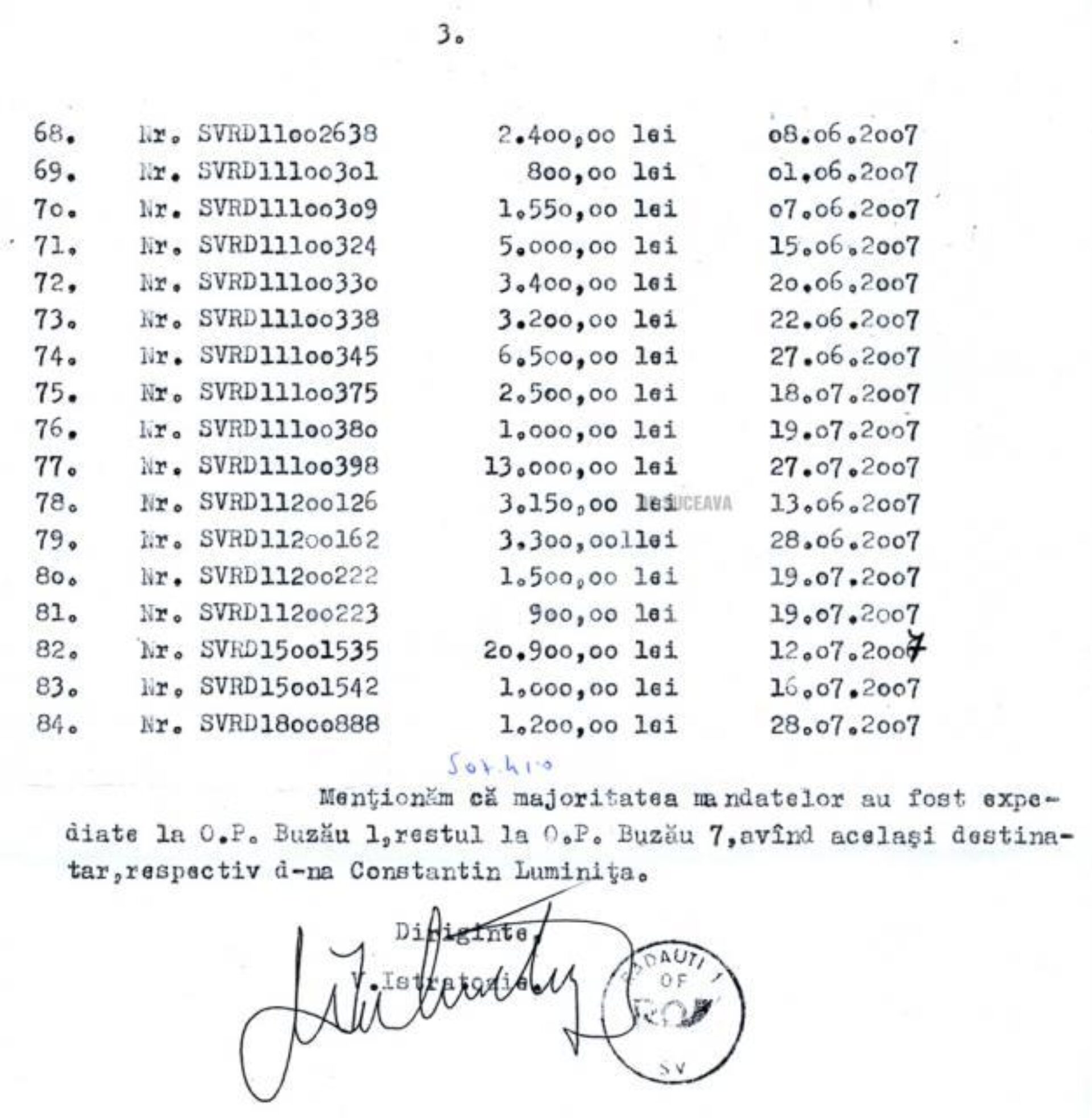 După cum confirmă mandatele online trimise de suceveancă către Luminița Constantin (84 numai prin Poșta Română), sume mari de bani au început să ajungă în contul celei din urmă. Lista, eliberată drept dovadă de Oficiul Poștal Rădăuți, arată că tânăra îi trimitea bani de patru-cinci ori pe lună, în unele situații chiar și de mai multe ori. La început sumele erau de ordinul a câteva sute sau mii de lei noi însă, treptat, s-a ajuns la foarte mulți bani. De exemplu, pe 15 septembrie 2006, a trimis suma de 17.000 de lei. Pe 20 septembrie a virat din nou bani către Luminița Constantin, de această dată 13.000 de lei. La ceva mai mult de zece zile, pe 2 octombrie 2006, suceveanca a trimis suma de 21.250 de lei către aceeași persoană.