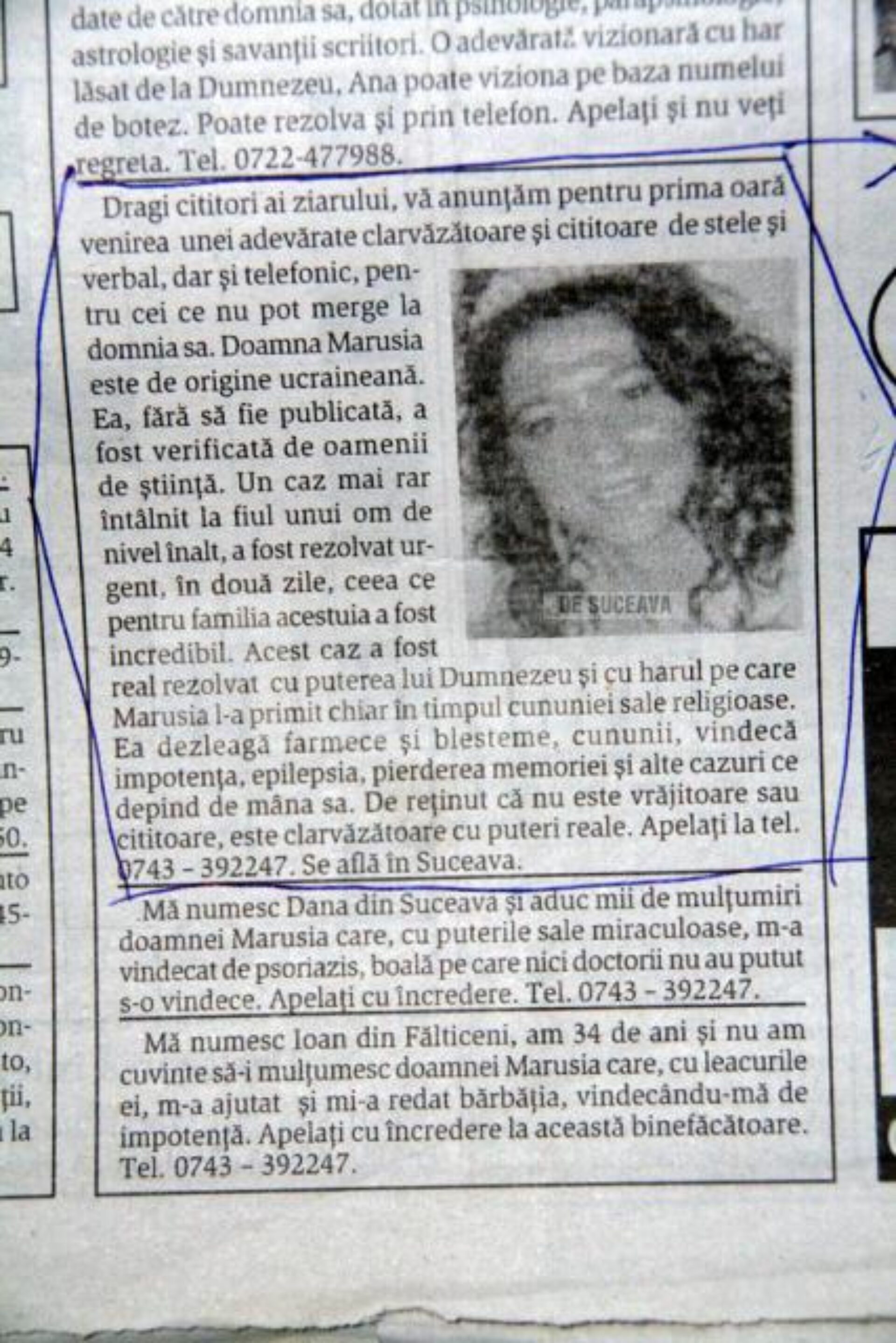 „Dragi cititori ai ziarului, vă anunțăm pentru prima oară venirea unei adevărate clarvăzătoare și cititoare de stele și verbal, dar și telefonic, pentru cei care nu pot merge la domnia sa. Doamna Marusia este de origine ucraineană. (…) Ea dezleagă farmece și blesteme, cununii, vindecă impotența, epilepsia, pierderea memoriei și alte cazuri ce depind de mâna sa”, este o parte a mesajului femeii, însoțit de o poză, care însă nu este a sa. Lângă acest anunț, un altul prezenta un anume Tudor din Botoșani, care îi mulțumea doamnei Marusia pentru că l-a rezolvat în maximum 48 de ore, fără a detalia modul în care „l-a rezolvat” și ce problemă a avut.